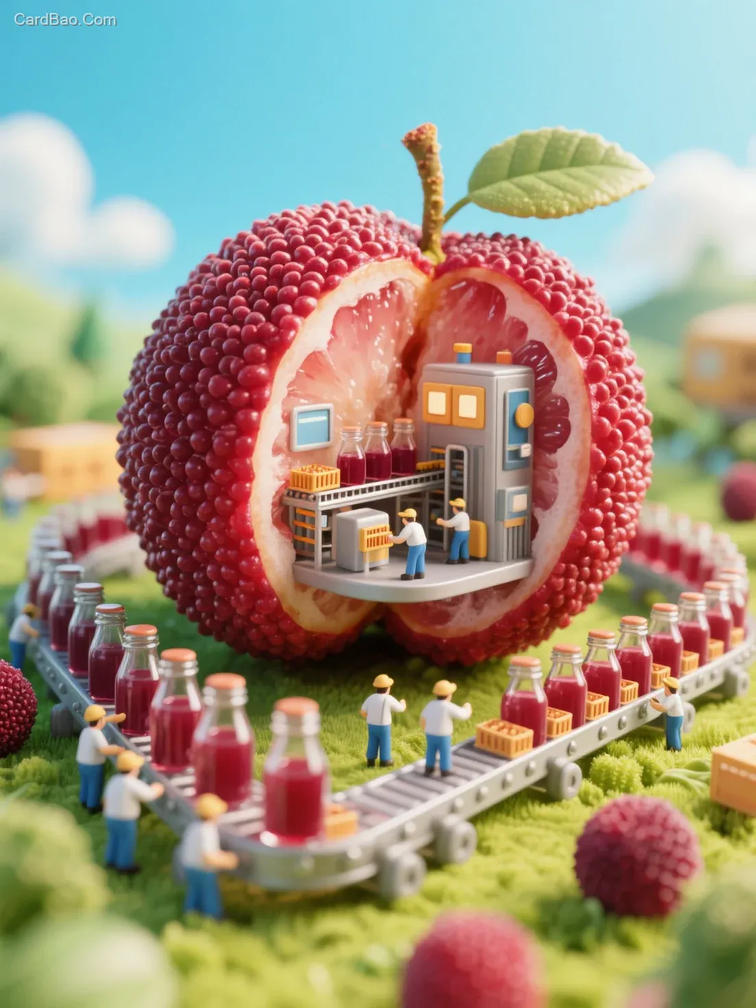 微缩景观,一个巨大的杨梅,切开一半,露出里面有一个微型工厂,工厂生产线正在生产杨梅汁,工人们正在忙碌,生产线延伸出来,源源不断的玻璃瓶杨梅汁运出,3D动漫卡通风格,色彩鲜艳,细节丰富,超细节刻画,超高画质,