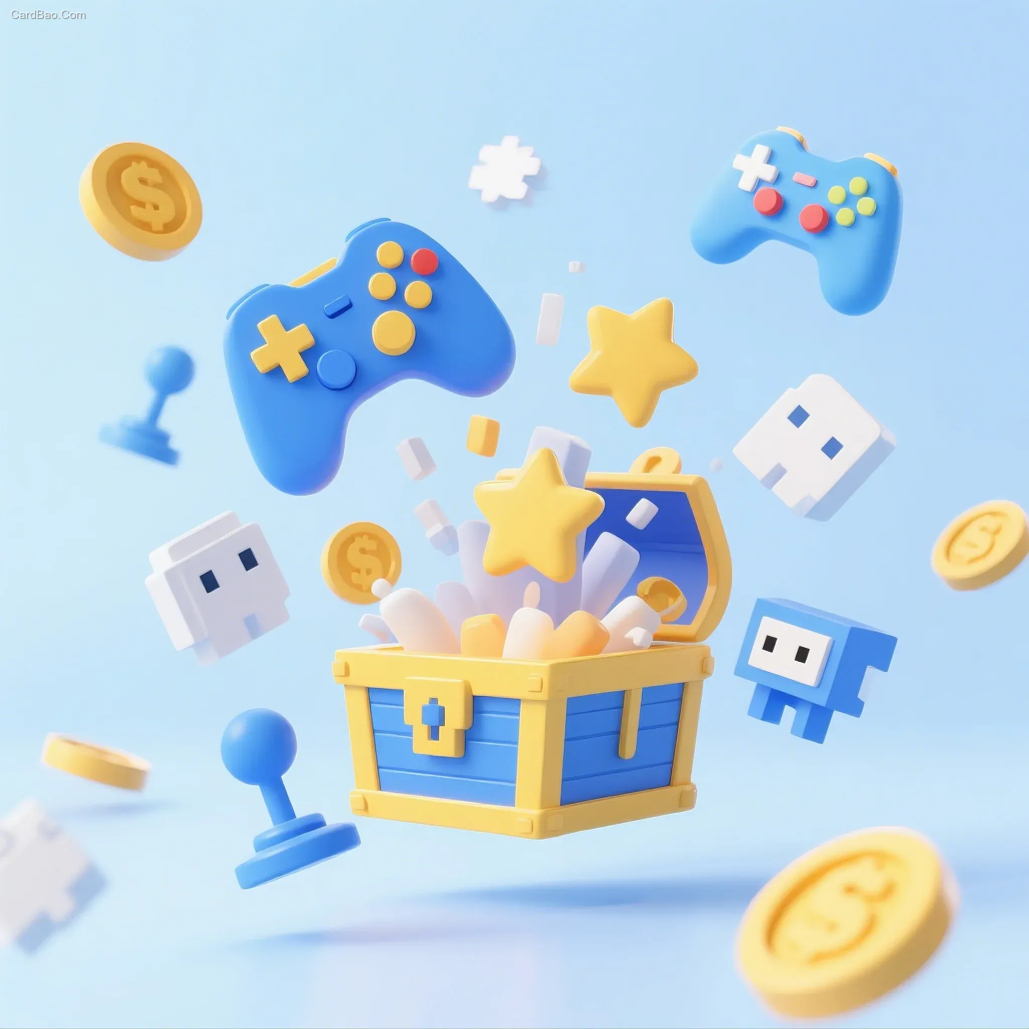 干净清爽的插画,背景为浅蓝色的柔和渐变,很多的3D卡通风格元素,如游戏手柄、金币、摇杆、星星和像素化角色从宝箱喷出,颜色以蓝色、黄色和白色为主,,设计活泼有趣,以蓝色主题为主,优化适合移动端界面