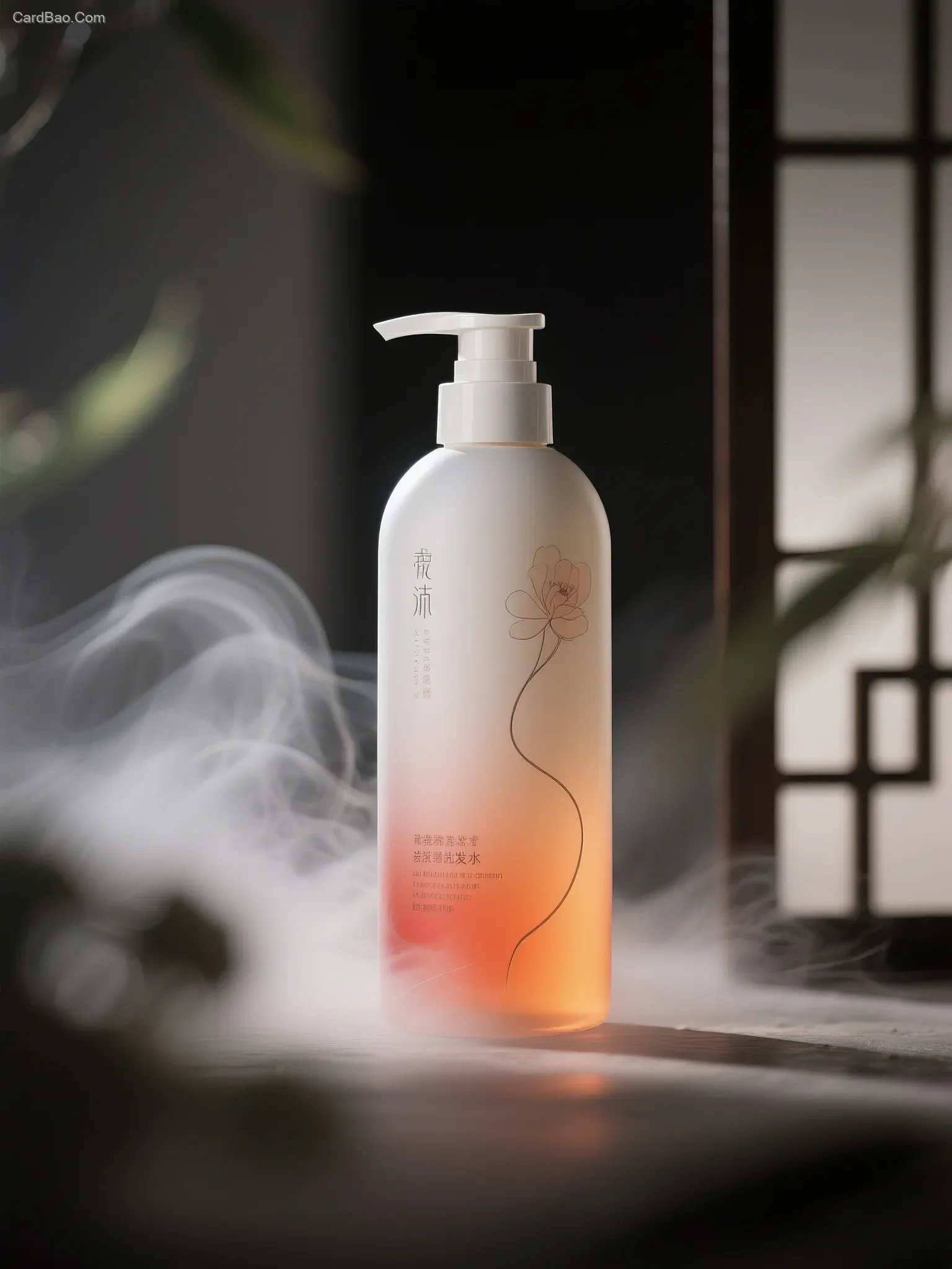 产品商业摄影,洗发水包装,东方美学, 轻雾 渐变,明暗 层次丰富 暗花,有融化、弥散渐变之感,线条优美。极简主义,中式美学,亦真亦幻之境,沉醉 艺术 独特魅力中,韵味 神秘气息。洗发水瓶与空间组合、模糊效果 光圈、拖影、动感模糊。用高纯度色彩、撞色对比色搭。光影艺术 复杂光影、瓶子被光影包围 大师杰作
