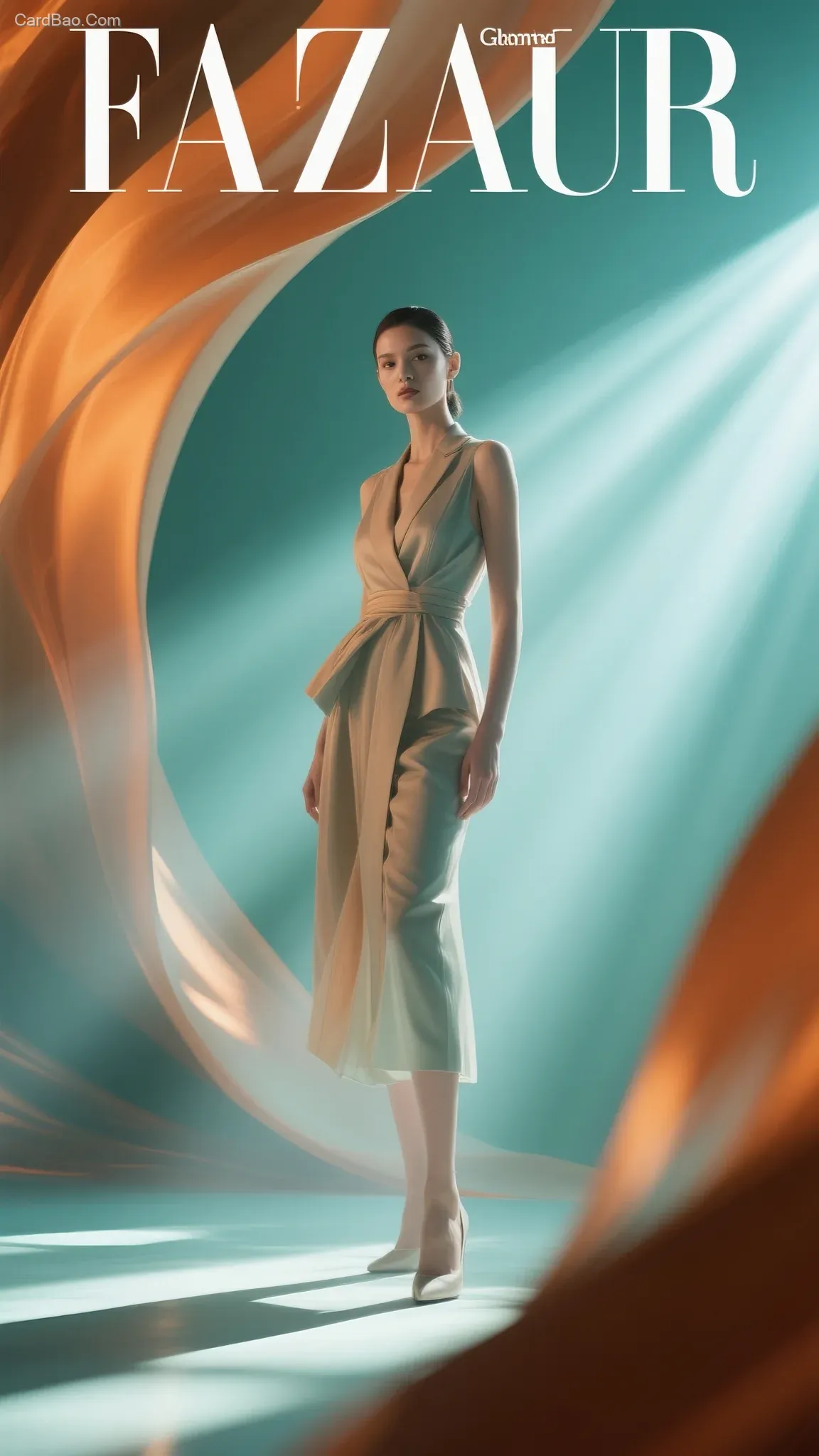 女,精致的五官,艺术感,皮肤白皙,顶级时尚杂志大片构图,光线跟踪,光影,层次感,立体感,最佳质量,前景虚化,8K,丰富的色彩,青橙色,流体背景,全身,丁达尔光效,杂志封面,高级感,