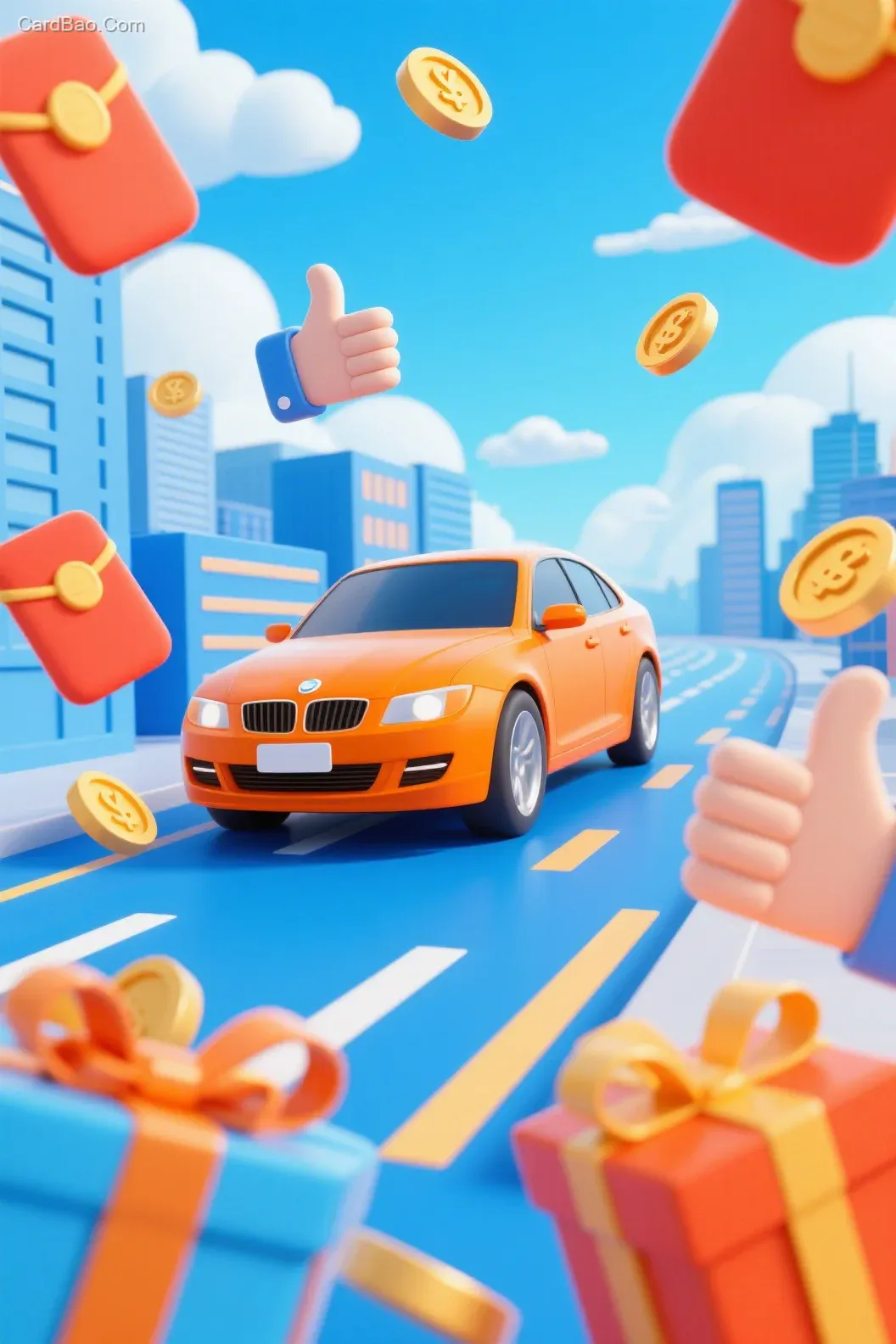 绘制一幅现代风格插画,画面中心是一辆橙色的 3D 汽车,呈现出行驶中的动感姿态,周围环绕着点赞图标、红包、礼物盒、金币等元素,象征着财富与便捷。背景是蓝天白云下的城市建筑,营造出明快的氛围。整体风格活泼且富有现代感,突出贷款服务的高效与吸引力。