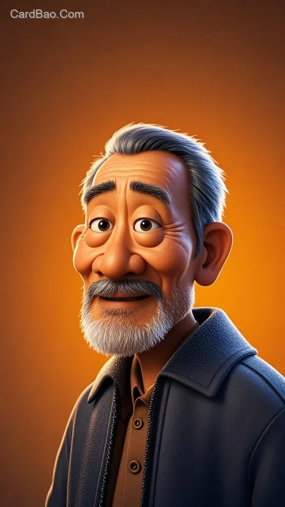 中国演员李雪健的卡通图像,抽象,夸张,高清细节,橙色背景。迪士尼梦工厂风格。 3D卡通,伦勃朗光