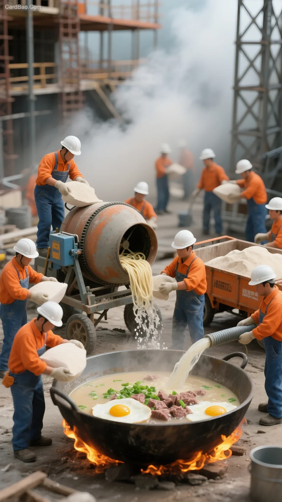 微缩景观,3D渲染,微缩风格,建筑工地场景,多名头戴白色安全帽、身穿橙色工作服和蓝色工装裤的工人,有的在搬面粉,往搅拌机里倒着,机器不断的搅动着,一辆拉水车停在搅拌机旁边工人接着水管往搅拌机机浇着水,搅拌机出口不断的流水面条,下面放着一口大铁锅,锅里浓汤滚滚,锅里飘着葱花,还有几片牛肉,一个鸡蛋,锅下面是个管制的钢架,火苗滚滚,背景有烟雾营造出忙碌氛围,整体画面细节丰富,写实逼真。