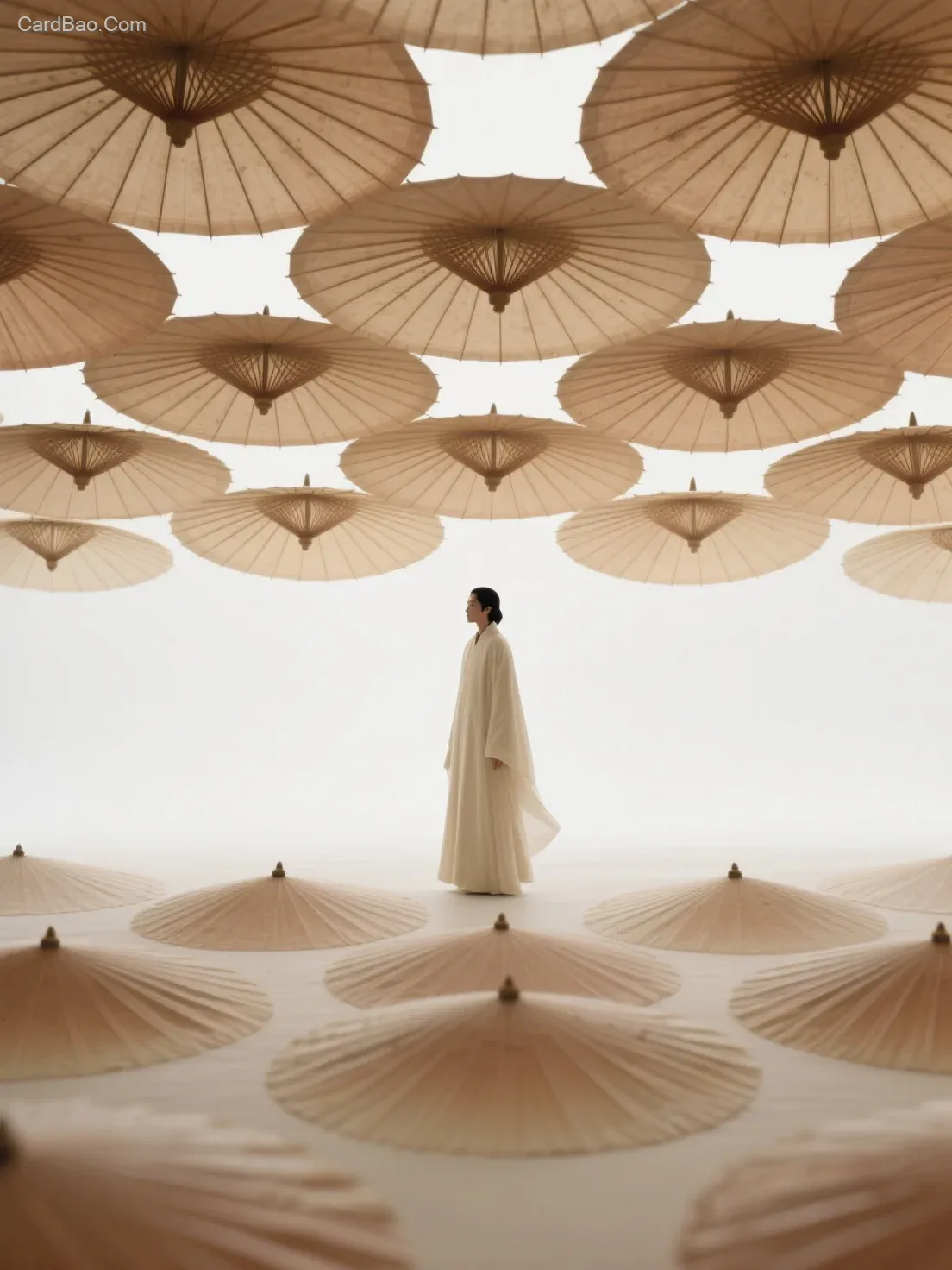 高视角,特写,巨大的空间,油纸伞,叠加,大面积留白,空灵,简约,写意,模糊,前后层次感,一个孤独的人,米白色,由上而下渐变,颜色由深到浅渐变,视觉冲击,东方美学