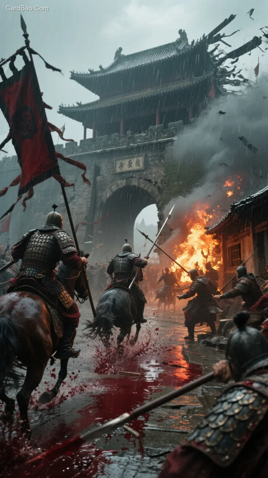 Theme: Cavalry of the An Lushan Rebellion storms through Chang'an's city gates; Tang imperial guards fight to the death with spears in desperate resistance. Collapsing palace eaves crush fleeing eunuchs, while burning civilian homes illuminate the blood-soaked streets.