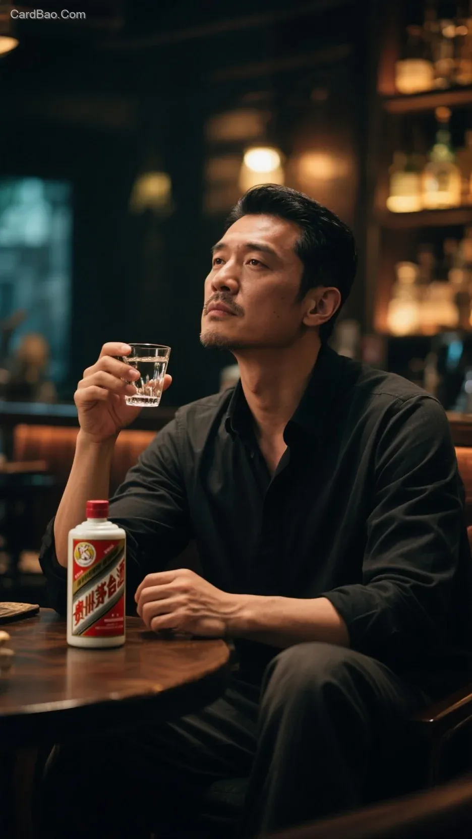 A mature, handsome Chinese man around 40 years old with a tough, weathered face sits in a bar. His head is slightly tilted upward, holding a baijiu glass in his hand, with a bottle of Moutai next to him. He wears a lonely expression, and the lighting is dim.