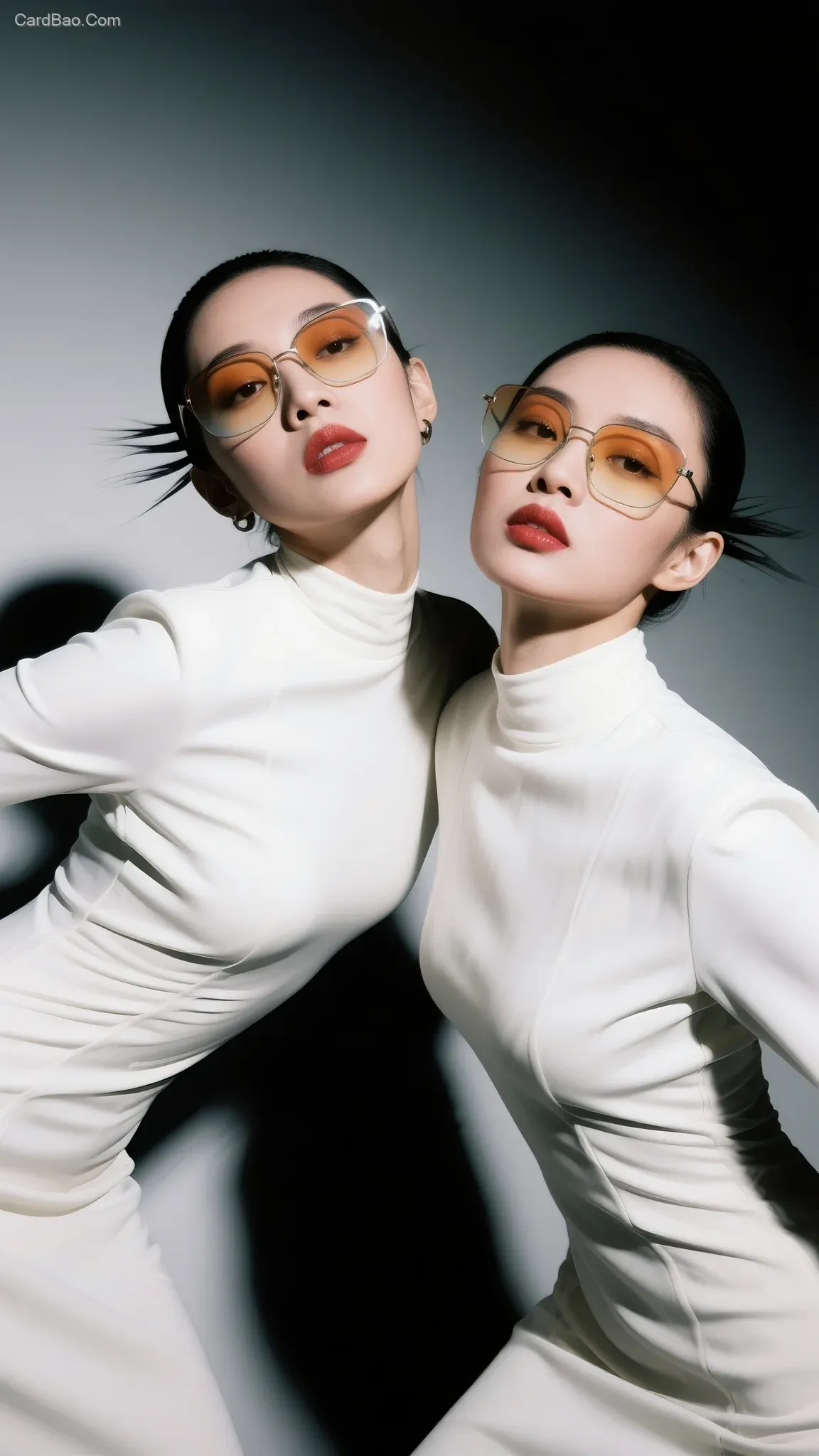 时尚人像,低角度,双胞胎,白肤白皙,两人激烈互动,夸张的五官,强调唇部,盘头发,渐变色玻璃眼镜,细腻纹理,水质感时尚连身服装,淡妆,随意的姿势,透视感,细节丰富,丹凤眼,忧郁的眼神,戏剧化光影对比,黑白琥珀对比色,Sandara Tang的细腻渐变和天野喜孝的飘逸装饰,纯色墙纸简洁背景,使用厚涂技法搭配哑光质感,强调人物轮廓,整体呈现都市感与电影风碰撞的美感。