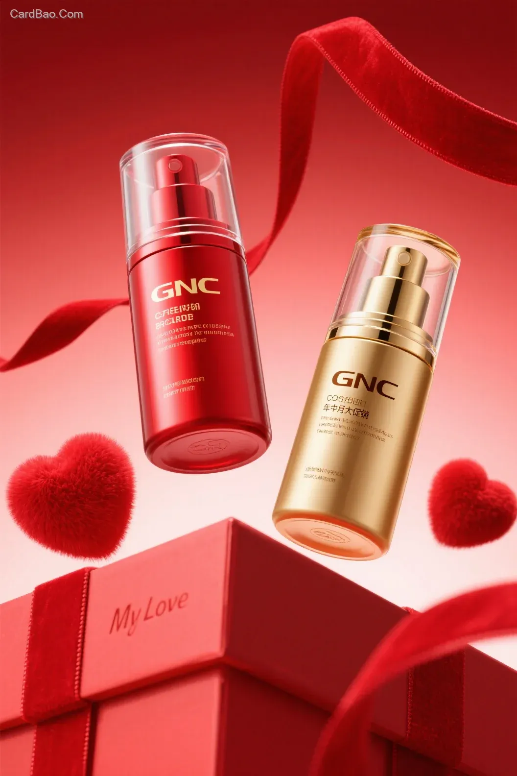 一张时尚广告图,主体为两瓶 GNC产品,一瓶红色,另一瓶金色,产品为主观镜头拍摄,主要显示产品,放大,特写镜头给到产品,产品拍摄角度为仰视,全息投影,c4d渲染效果。背景采用高端红色渐变色调,搭配装饰性红色丝绒细带与精细毛绒红色爱心元素,产品在底部磨砂红色礼盒上,礼盒隐约印有My love。产品质感与促销活动氛围。整体风格突出促销信息,以鲜明的色彩和清晰的产品展示吸引购买,营造热烈的促销氛围。既强化了品牌的专业属性,又充分烘托出年中大促的热烈气氛,极具吸引力与转化力