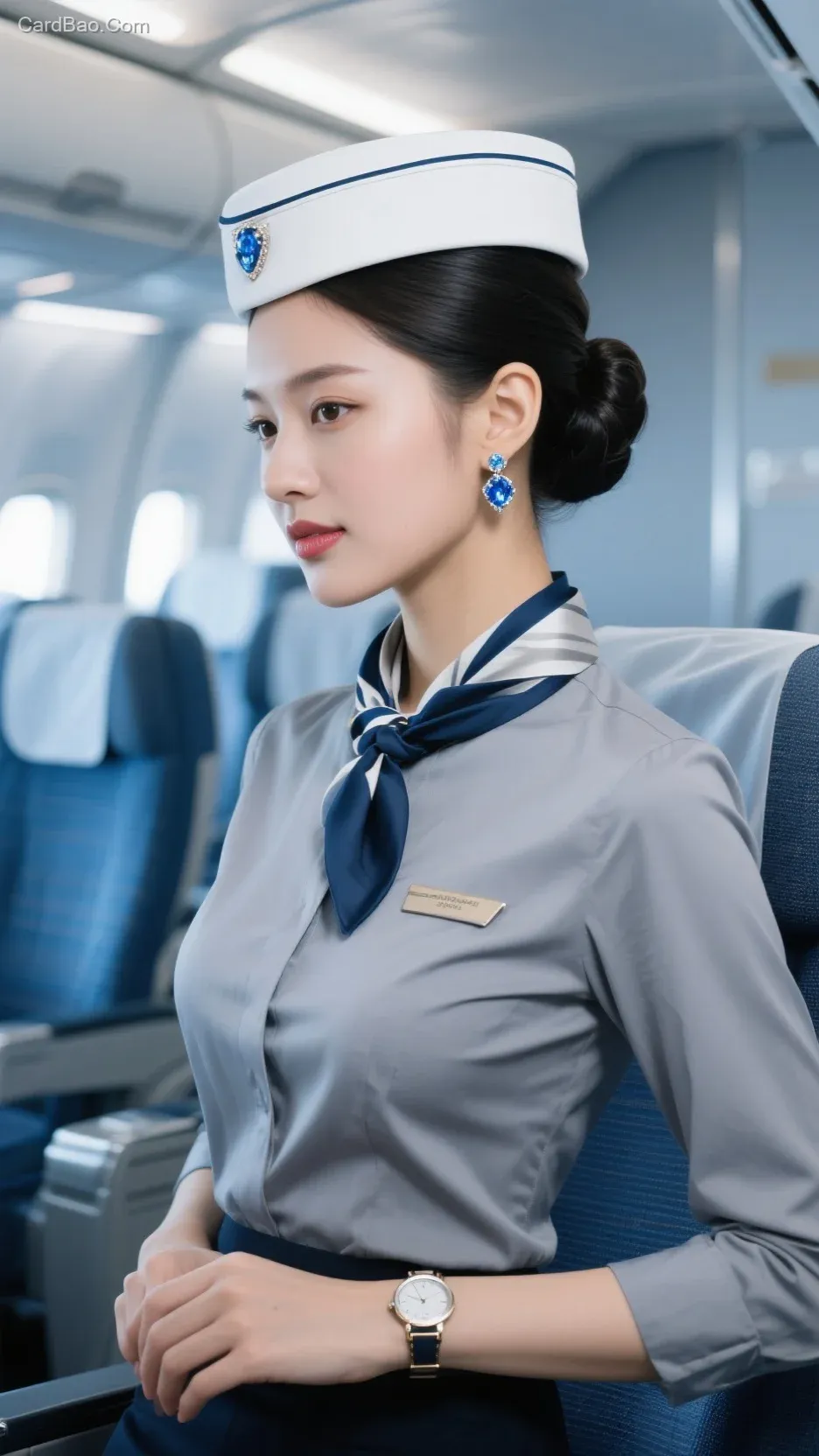 帮我生成一张图片:年轻空姐,妆容精致,乌黑头发整齐盘起,戴着白色空姐帽,丰满性感,佩戴华丽的蓝色钻石耳饰和手表,脖子上配有丝巾。身着灰色衬衫,迎宾姿势,背景为飞机公务舱。比例 9:16。