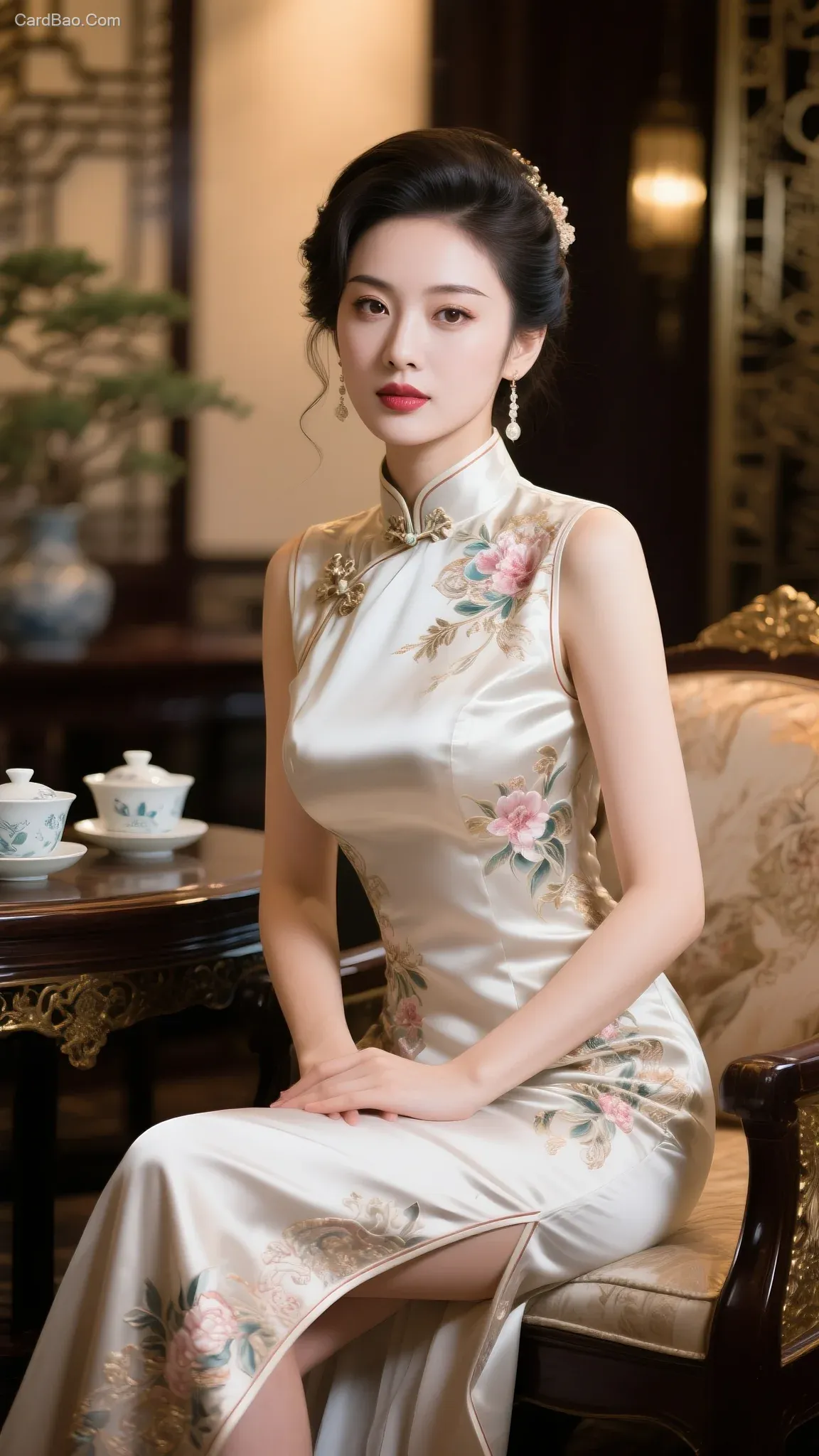 The ultimate tall and sultry goddess possesses slender willow-leaf eyebrows, captivating peach blossom eyes, full and lush brows with large, expressive eyes. Her gaze is flirtatious and brimming with charm. She is dressed in an opulent and seductive silk cheongsam, with an elegant hairstyle and skin as fair as jade. Her facial features are exquisitely sculpted and three-dimensional, radiating high-end sophistication. Her lively, soul-piercing eyes seem capable of enchanting hearts as she sits gracefully in a top-tier luxury teahouse, exuding poise and elegance. The interplay of light and shadow creates a dreamy atmosphere, with ultra-high-definition details and extreme realism in 4K ultra-clear quality. Multiple outfits, diverse scenes, various hairstyles, and a range of poses are included, featuring masterful close-up shots.
