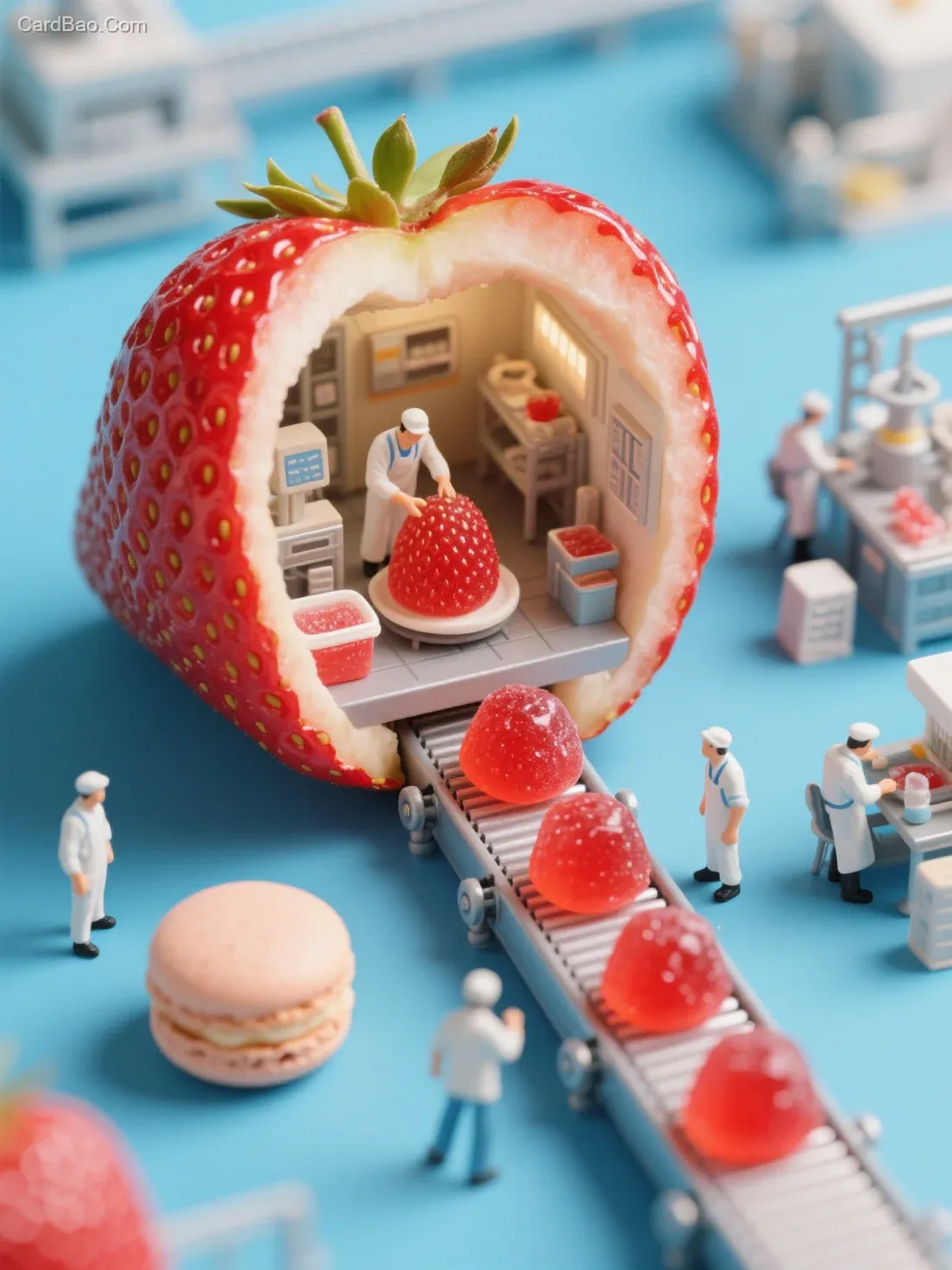 Generate an image: The interior of a sliced strawberry contains a miniature factory where workers are producing red strawberry jelly candies. The jelly candies lie on conveyor belts being transported outward. The blue background features a bustling work scene with tiny figures nearby. The style should be microphotography, miniature model, diorama, with a soft pastel macaron color scheme and 3D rendering. The entire image should have a strong sense of perspective, abundant details and textures, creating an overall warm atmosphere. High resolution, high quality, and high detail. Aspect ratio 2:3.