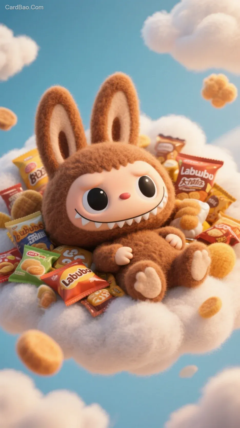 一幅充满暖色调的毛毡画,整体呈现出浓郁的毛毡风格,每一处细节都散发着毛毡独特的质感与魅力,Q版现代动漫风格,一只labubu,泡泡玛特,大统领,卡通风格,拟人化角色,兔子耳朵,棕色毛发,大眼睛,黑色瞳孔,尖牙齿,3D渲染,躺在一堆零食中,飘在云彩上,憨态可爱,如梦境/般