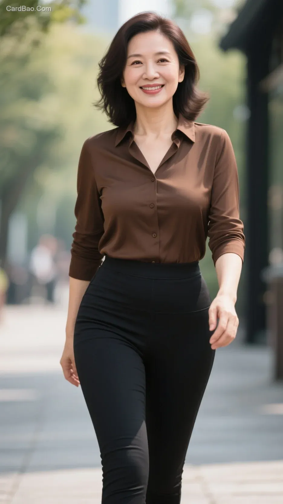 一位42岁成熟的中国美妇,咖啡色紧身衬衣衫,黑色紧身打底裤,眼睛干净而温柔地向前看,微笑,美丽大方,美丽的眼睛,成熟,女人味十足,户外背景,哈苏 H2D ,专业照片,全身镜头,广角视角