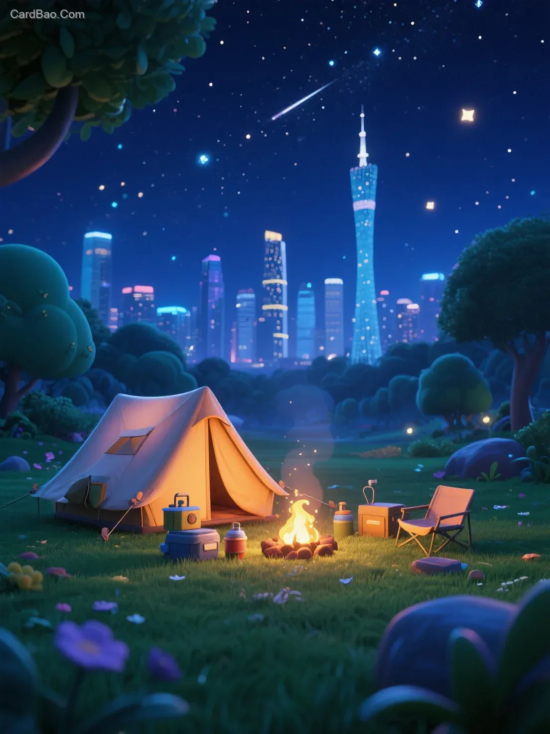 采用Octane渲染器打造的3:4比例卡通化夜晚露营场景,构建广州天际线背景下的奇幻草地露营画面
