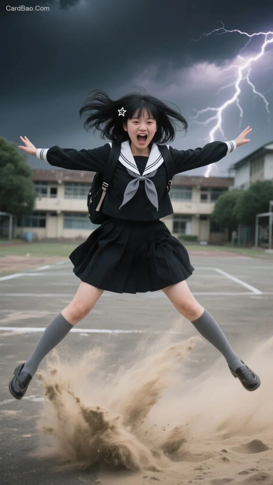 帮我生成图片:亚洲少女,黑色长发随风飘散,缕空小星星发饰,空气刘海,黑色白边JK制服,灰色胸巾,灰色裤袜,背着日式书包,张开双臂,双腿张开,浮在半空,下方形成一股旋风,沙尘飞扬,正面,校园空地,表情严肃,大吼,闪电,天色渐黑,真人写实。图片风格为写真,比例 9:16。