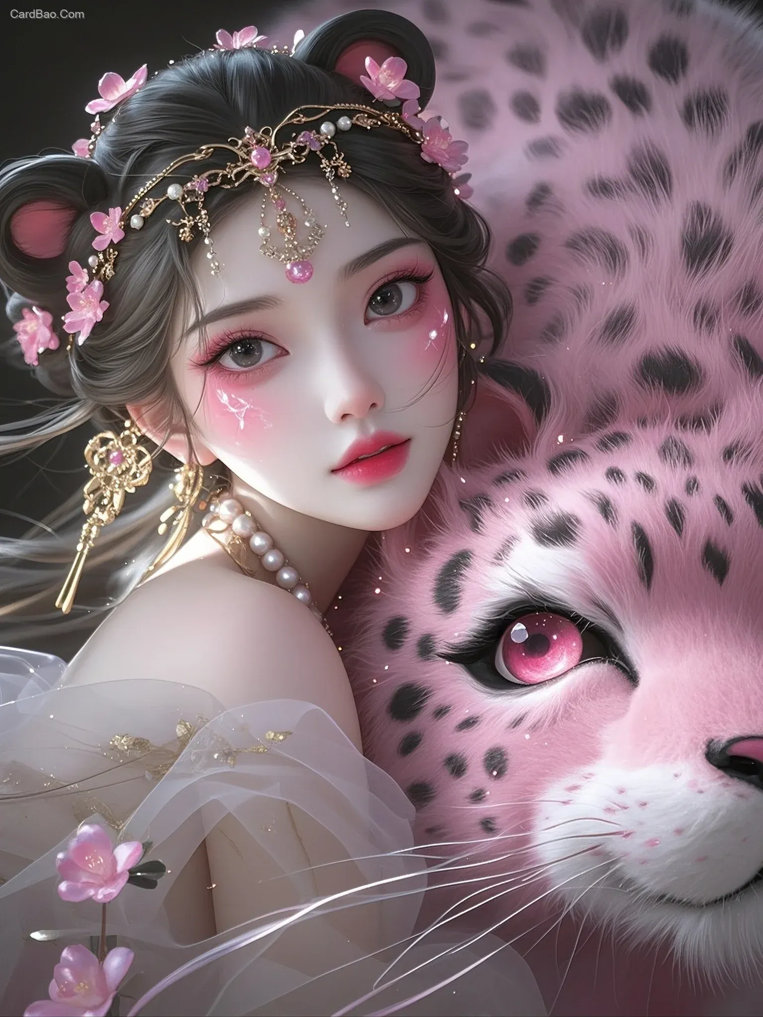 梦幻艺术风格,古风美女画着桃花妆,桃花眼,淡粉色纱衣,锁骨,头戴首饰,粉色钻石,依靠着巨大的粉色毛茸茸豹子,发丝随风飘动,发丝细腻刻画,眼睛清澈明亮,肤若凝脂,构图和谐,细节丰富,高级感,质感,粉色白色为主,金色为辅,慵懒,邪魅,三维,3d渲染,3D仿真,景深,虚拟引擎5渲染,柔焦,高细节,真实感,珍珠肌理,肌理感,CG厚涂,辉光效果,生物发光,粒子发光,84K超高清,极致细节