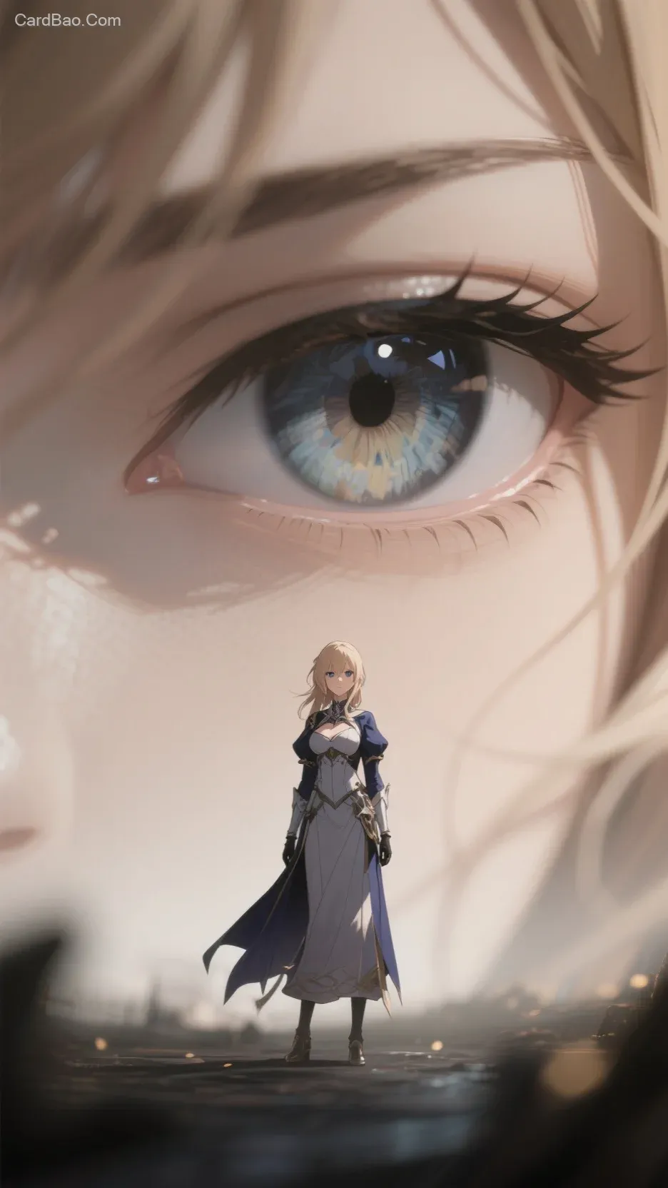 一个富有创意的场景:Fate游戏的阿尔托莉雅·潘德拉贡优雅的站在画面的前景。背景呈虚化状态,仅展示她特写的眼睛。那双眼睛仿佛正凝视着观看者。此图像以超高清8K分辨率渲染,运用了先进的构图技巧和电影级的光影效果。每一个细节都经过精心雕琢,以确保卓越的画质和丰富的细节。背景应保持柔和的虚化状态,远景拍摄,以突出主体那引人注目的眼睛。