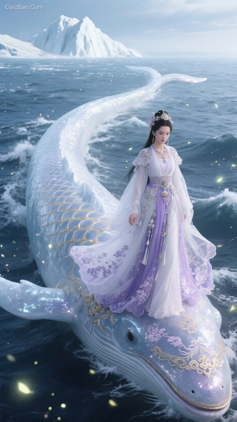 Wuxia epic film style, aerial view. In the northern seas resides a Kun, its body stretching thousands of miles, massive enough to blot out the sky. Its surface is covered in mysterious gilded transparent scales, shimmering with icy white radiance. The Kun's elongated form is vast beyond measure, with dynamic particle effects simulating swirling halos of light. Along its broad back stand towering white-glowing icebergs. The sea roils with turbulent waves. The entire scene brims with majestic grandeur, exuding intense dynamism—like dancing particles, firefly-like white-ice particle light effects, motion blur. A celestial maiden stands upon the Kun's colossal back, dressed in soft lavender and snow-white robes crafted from sequined chiffon, velvet jacquard, organza, lace, fringe, embroidery, and prints. Her attire features intricate cascading folds, opulent accessories, and traditional garment motifs with hidden patterns.