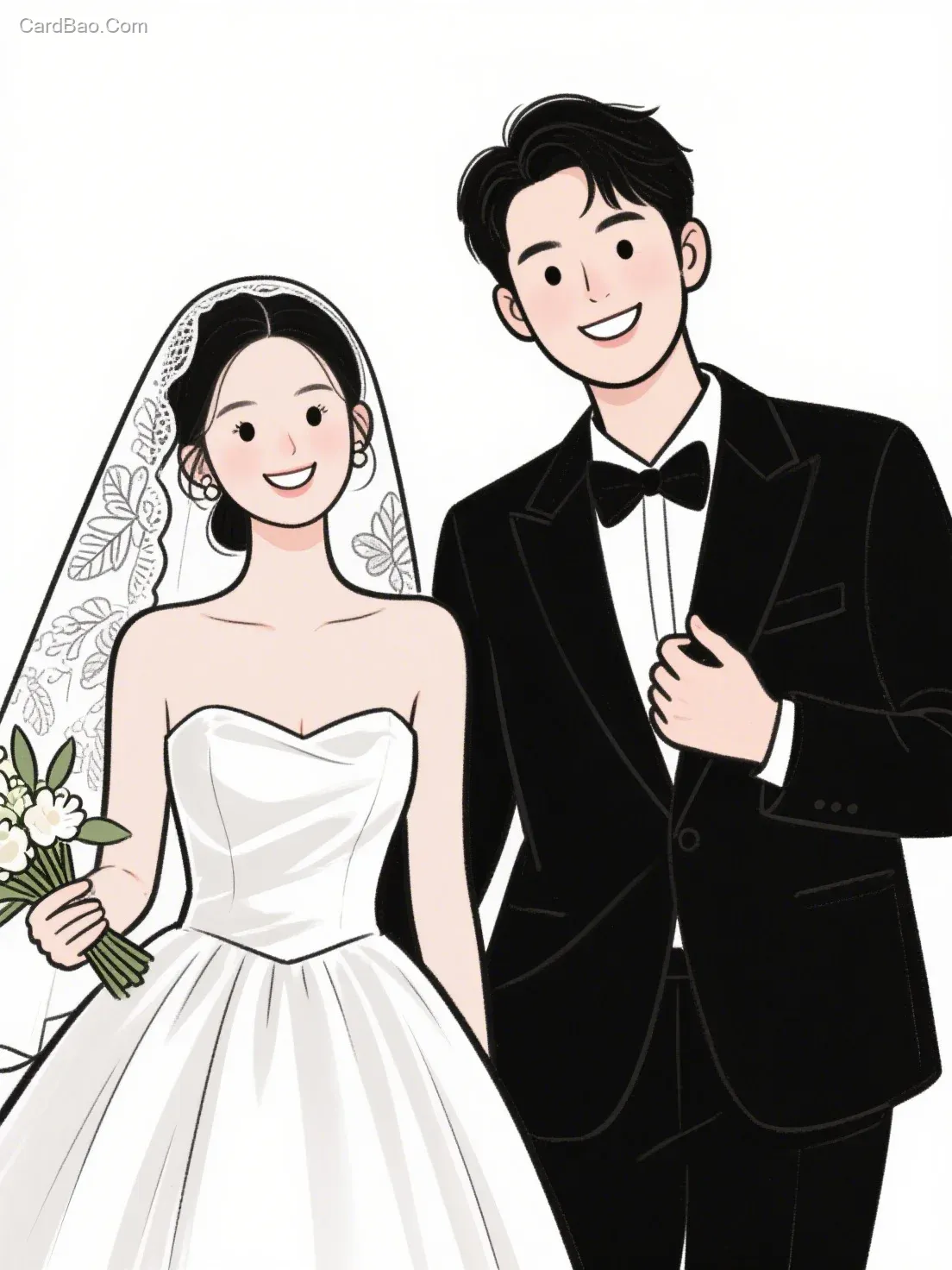 一对手绘风格的新郎新娘,新郎身着黑色的西装,新郎一手扶西装衣襟。新娘穿白色抹胸缎面蓬蓬裙婚纱,婚纱胸口平的。新娘手拿捧花,新娘头发中分精致低盘发,头纱大树叶花纹蕾丝,盖住一侧肩膀。风格极简高级,富有手绘质感,粗线条简笔画变形,简笔画五官。纯白色背景,细节精致,动作时尚,快乐氛围,浪漫甜蜜,全身构图看向镜头。