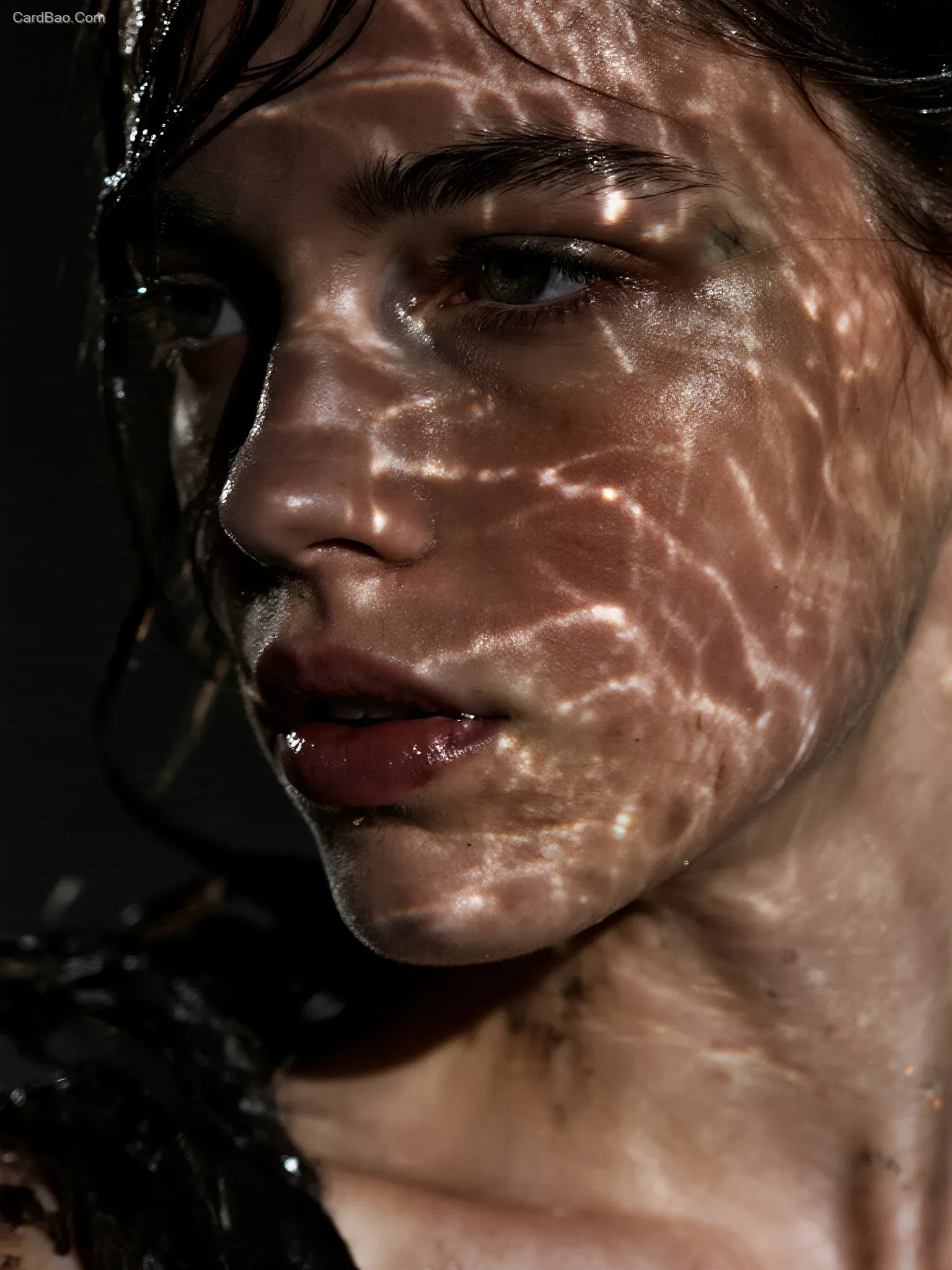 Unrestrained dark emotions, cinematic texture, Alexander McQueen style, dreamy light and shadow, textured reflections, disarray, decadence, refracted light, diffused glow, brown-black palette, abstract expression, artistic atmosphere, realistic style, emotional expression and narrative, melancholic, fashion art