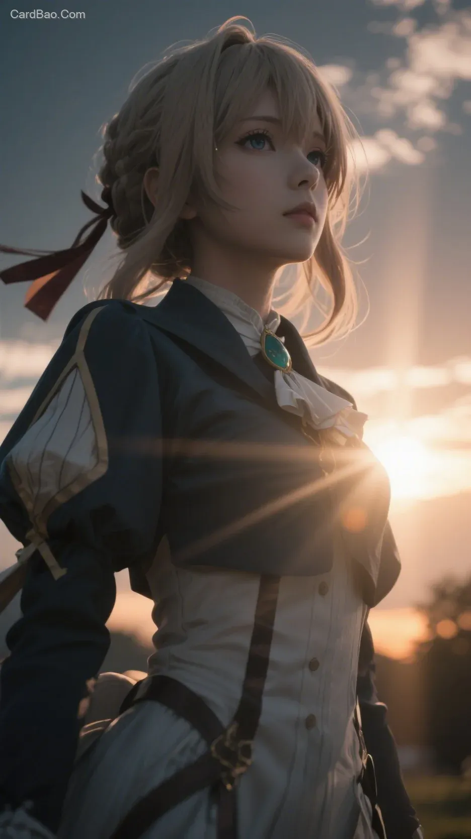 薇尔莉特,真人cosplay,高分辨率。渲染直出,摄影后期处理,黯淡,丁达尔效应。上半身特写镜头神圣,对角线构图低视角,仰拍镜头,动态模糊,夕阳下,气质,35焦段人像。3D虚幻