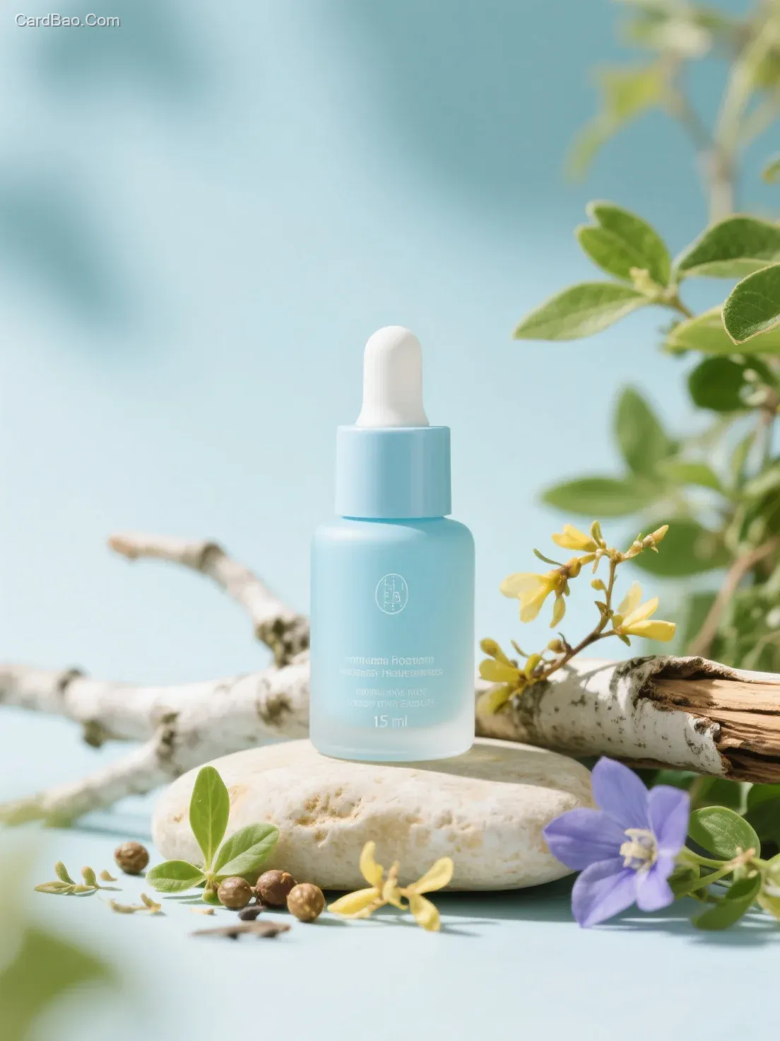 自然光,15ml淡蓝色护发精华拍摄,温暖的阳光,浅色石头,绿色植物,白柳树皮,金缕梅,连翘果,龙胆花等成分,光影氛围,淡蓝色背景,专业护肤品拍摄,