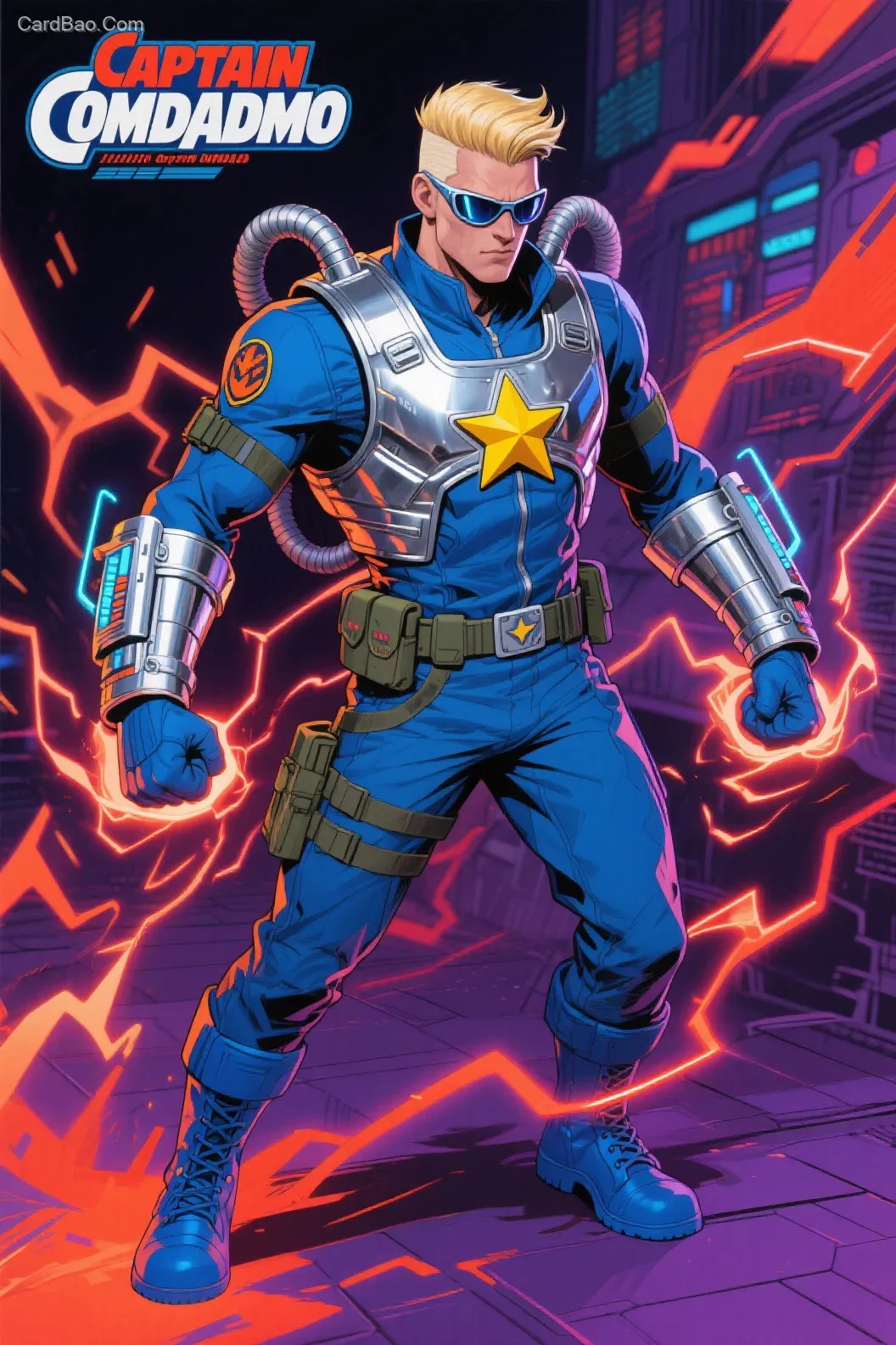 CG rendering style, a cartoon character from the 1990s arcade game *Captain Commando*, full-body portrait. A white warrior with blond slicked-back hair, wearing futuristic bar-shaped sunglasses, dressed in a blue combat military uniform. The upper body features a silver metallic vest with a yellow star-shaped badge on the left side, and silver metallic arm guards equipped with numerous electronic tubes. The arm guards are emitting powerful electromagnetic waves. The character wears blue boots. The artwork features exaggerated motion, intricate details, strong perspective impact, vibrant colors—blue and purple paired with orange-red—dynamic brushstrokes, a close-up shot, digital art style, and comic-style illustration.