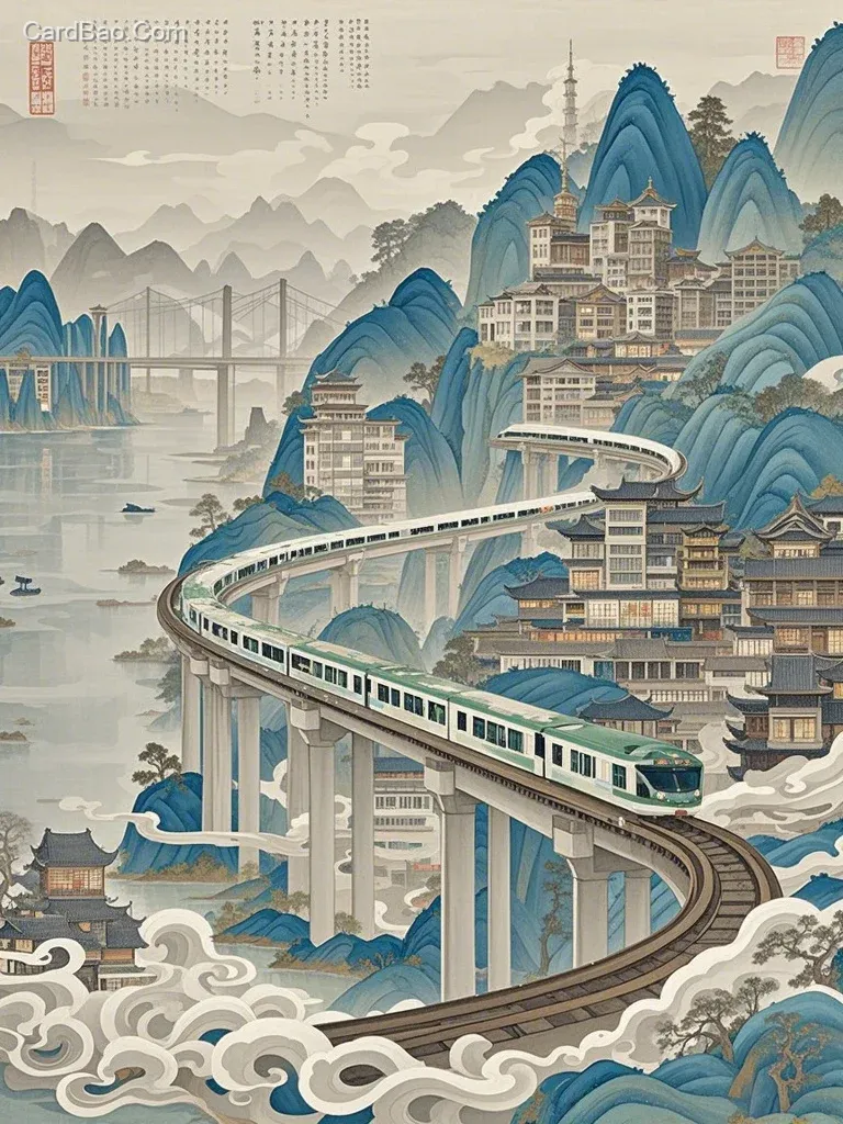 《山城轨道交通长卷》,富春山居图史诗风格,淡雅青灰色调,8K超高清细节,