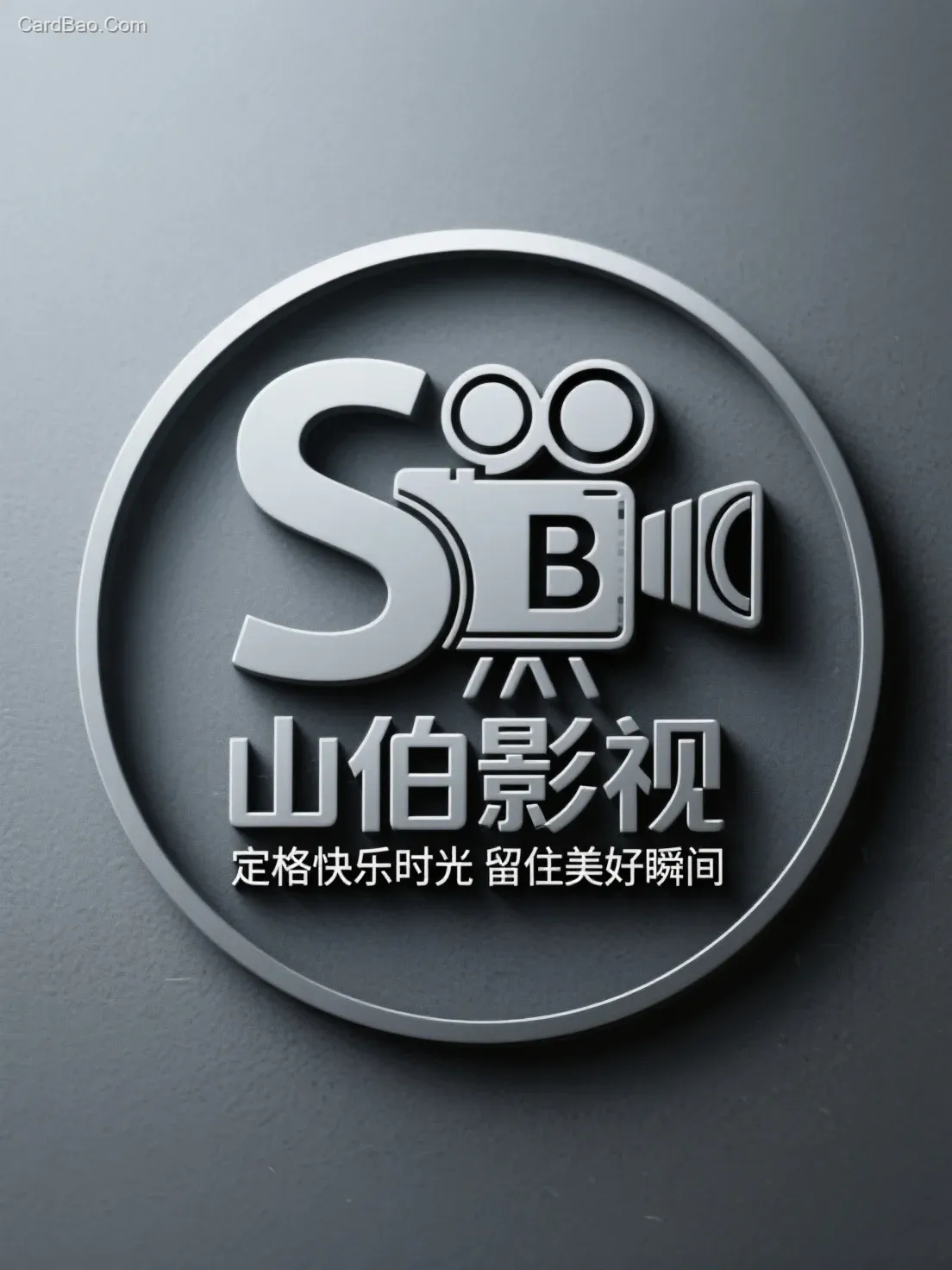 内凹陷风格,压痕效果一个logo圆形:“山伯影视”,“定格快乐时光 留住美好瞬间”圈内是一台摄像机和像机组合图案,凸显字母“S、B”