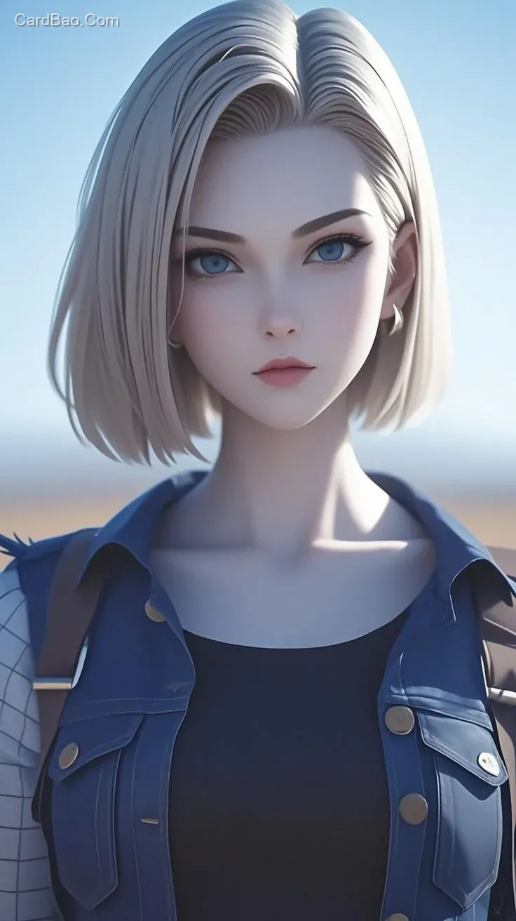 ## Dragon Ball, Android 18, flaxen hair, short hair, casual clothing, stylish and simple outfit, fair skin, graceful figure, high resolution, hyperrealism, full body, close-up shot, cool tones, soft lighting, static, mysterious, aloof, minimalist composition, generous negative space, photorealistic.