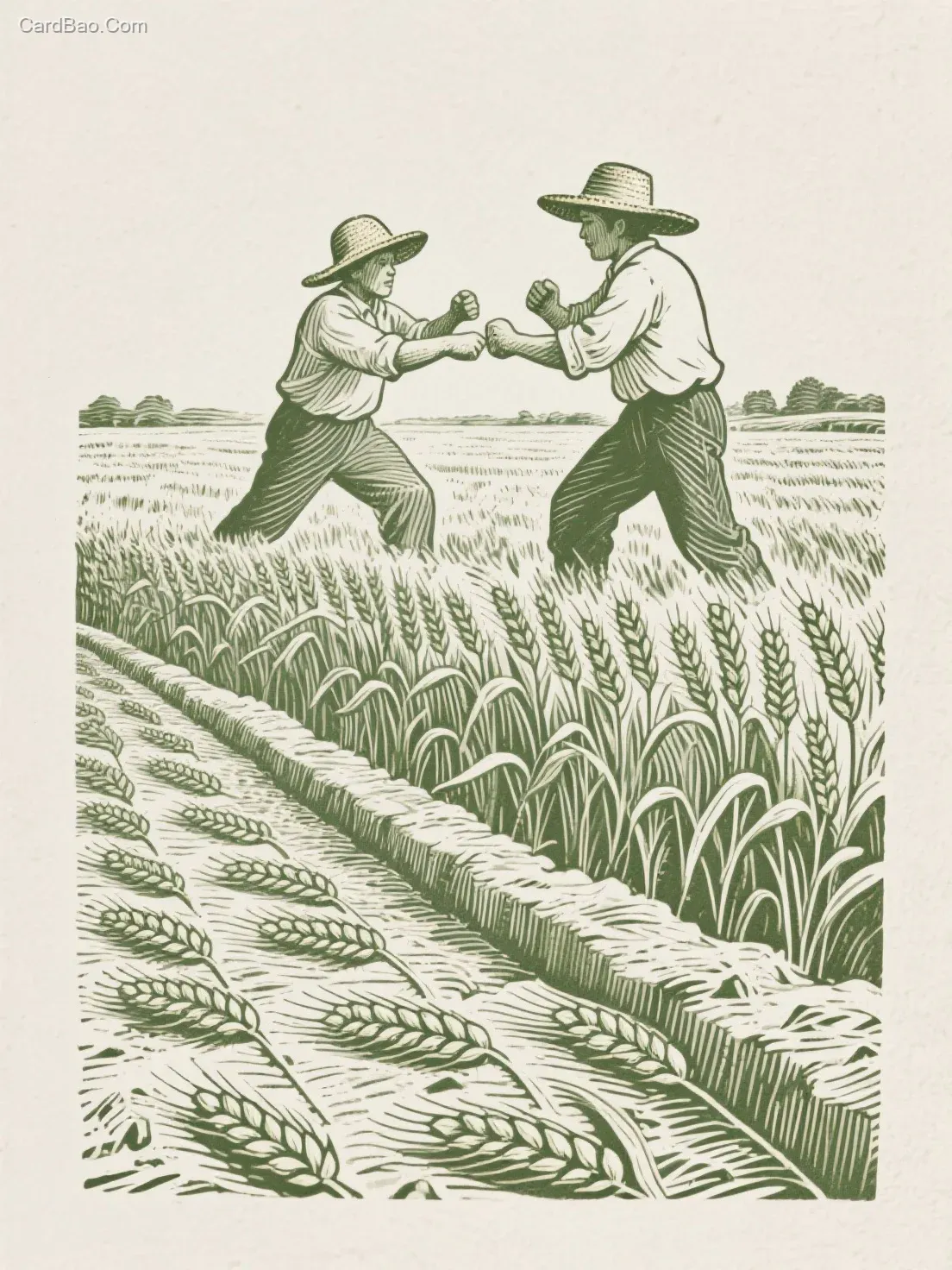 **Midground:** Two straw-hat-wearing farmers are engaged in a scuffle amidst the wheat field.