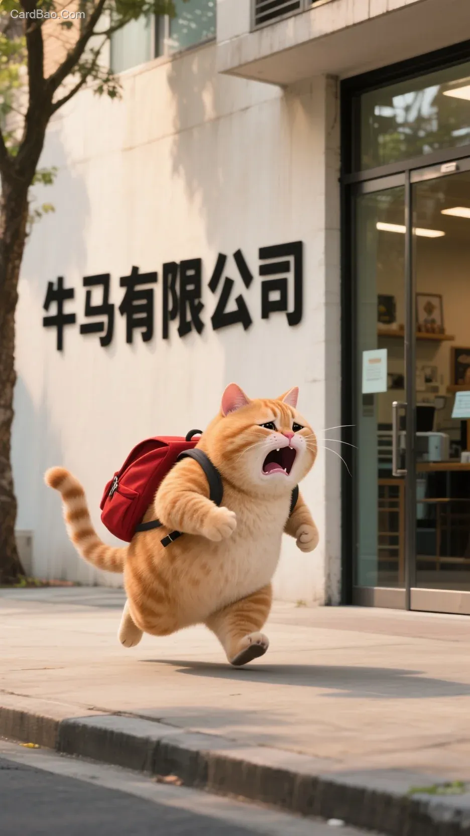 一只拟人化的大胖橘猫背着红色背包,悲伤的边跑边张大嘴巴,它的背后墙面上有 “牛马有限公司” 竖着字样,旁边是玻璃门,背景中可见建筑物与树木,逼真