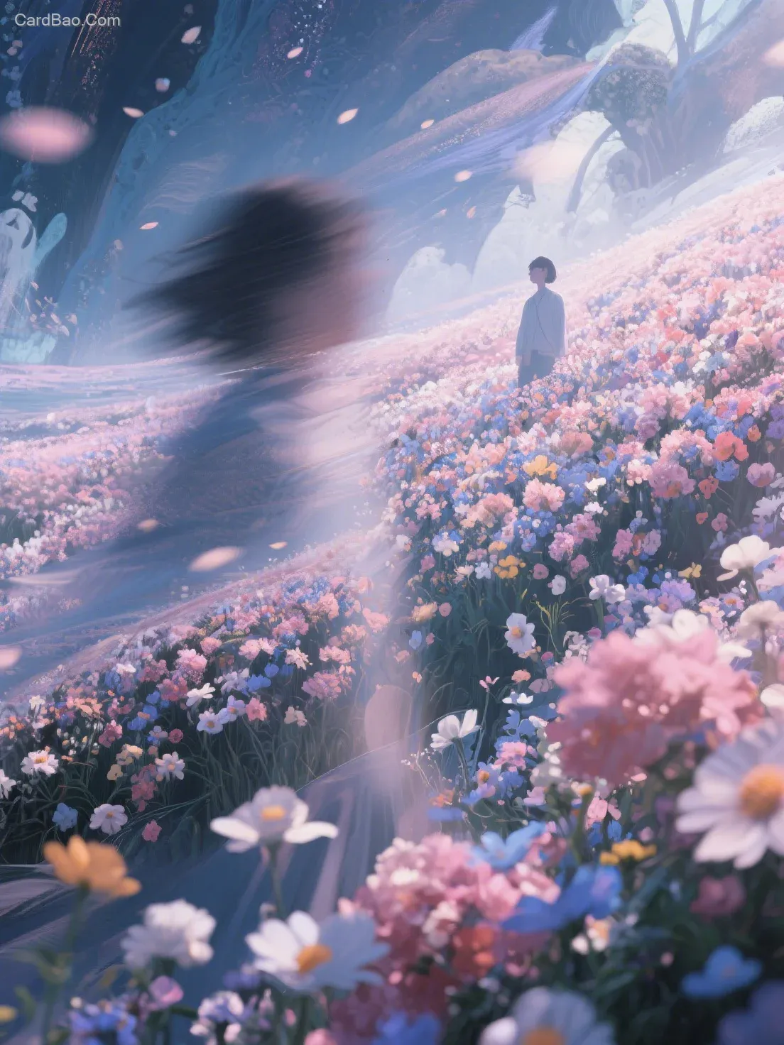 Illustration art, portrait photography, cinematic language, the imagery conveys a strong sense of storytelling. Grand scenes, dreams, a sea of flowers flowing into the eyes, motion blur, multiple exposures.