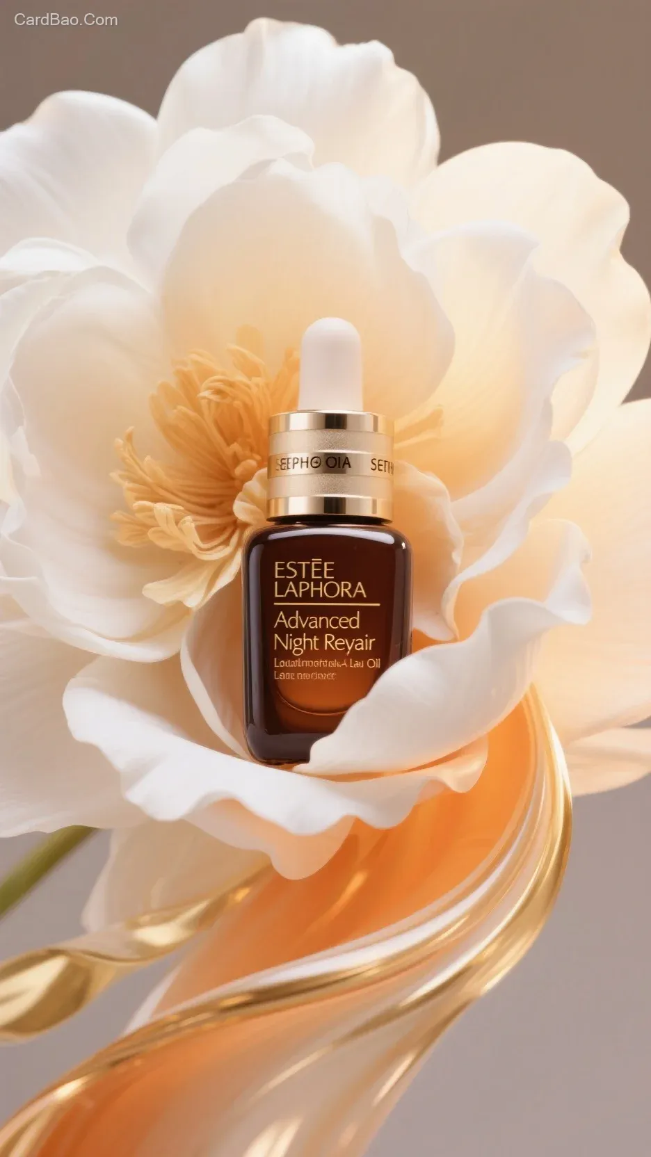 "The new Sephora luxury beauty oil is showcased for the first time, featuring the Estée Lauder Advanced Night Repair in the iconic small brown bottle. The product is elegantly wrapped in a large, delicate flower, styled with intricate floral details in white and gold tones. The image features a hyper-realistic rendering with fluid photography techniques, emphasizing flowing lines and a soft color palette of light orange and white. The cosmetics are positioned front and center, occupying more than half of the frame."