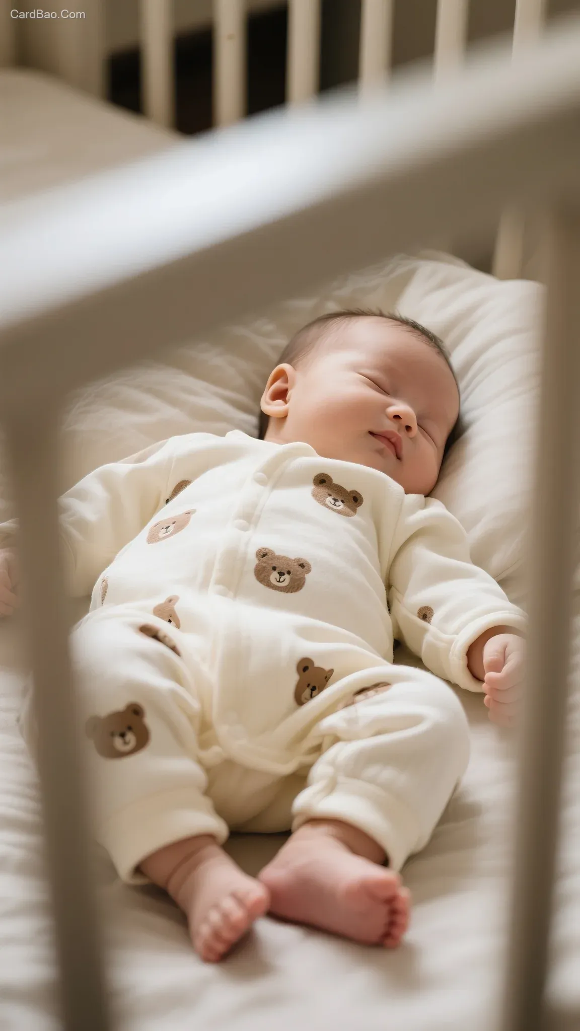 婴儿穿着米白色连体衣,上面有小熊图案,双脚露出,处于睡眠状态,背景模糊,透过类似婴儿床围栏的物体拍摄,温馨,宁静,婴儿休息场景。