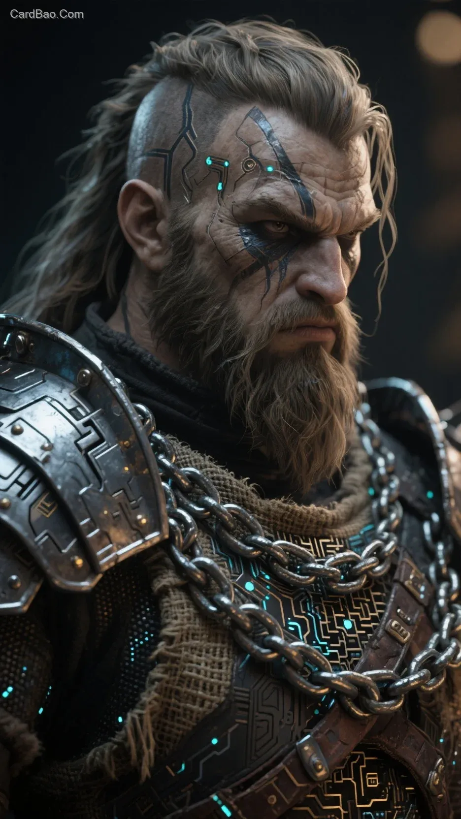 油画质感,动漫特写,北境野蛮人,钢铁链甲,电路纹理,微距视角,柔光暗调,金属肤质,发丝光晕,麻布装饰,粒子光晕,科技神性。