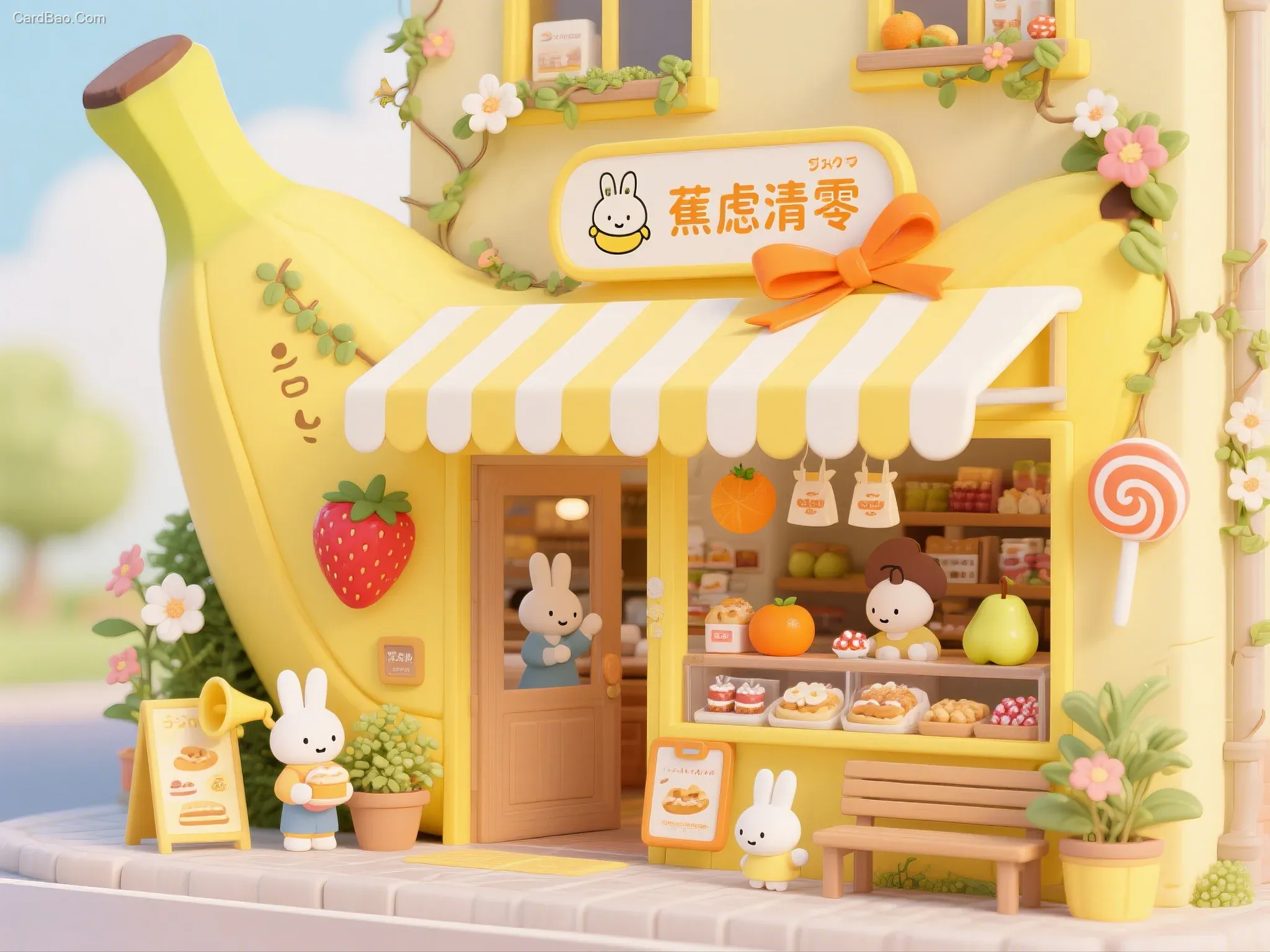 那是一个可爱的插图!它描绘了一个异想天开的黄色主题商店或售货亭,似乎完全由香蕉和糖果制成。以下是图像内容的细分:* **建筑:**主要结构类似于一个风格化的三维香焦色,可能是一个巨大的香焦色水果店。它有一个带有黄色和白色条纹的小遮阳篷,通过敞开的门口可以看到一个微型商店内部。* **角色:**有几个小巧、可爱的、像兔子一样的生物。有些人在大楼内,似乎是在照料商店,而另一些人则在外面,靠近小植物和看起来像长椅的东西。他们都有相似、友好的风格。* **商品:** 商店里充斥着各种水果相关的商品。有草莓,橙子、苹果、梨、糖果、小袋子(可能是橙汁或果皮)和其他甜食。店里还有一个关于其他烘焙食品的建议。* **装饰:**喇叭花和藤蔓装饰着建筑,赋予它花园般的品质。一条小丝带绑在遮阳篷上。风格深受可爱、卡通美学的影响。棚顶上的牌匾“蕉虑清零”。* **总体风格:**图像以柔和的柔和调色板绘制,具有明显的可爱(可爱)风格,在日本插图和商品中很常见。线条简洁,整体印象轻松甜美。