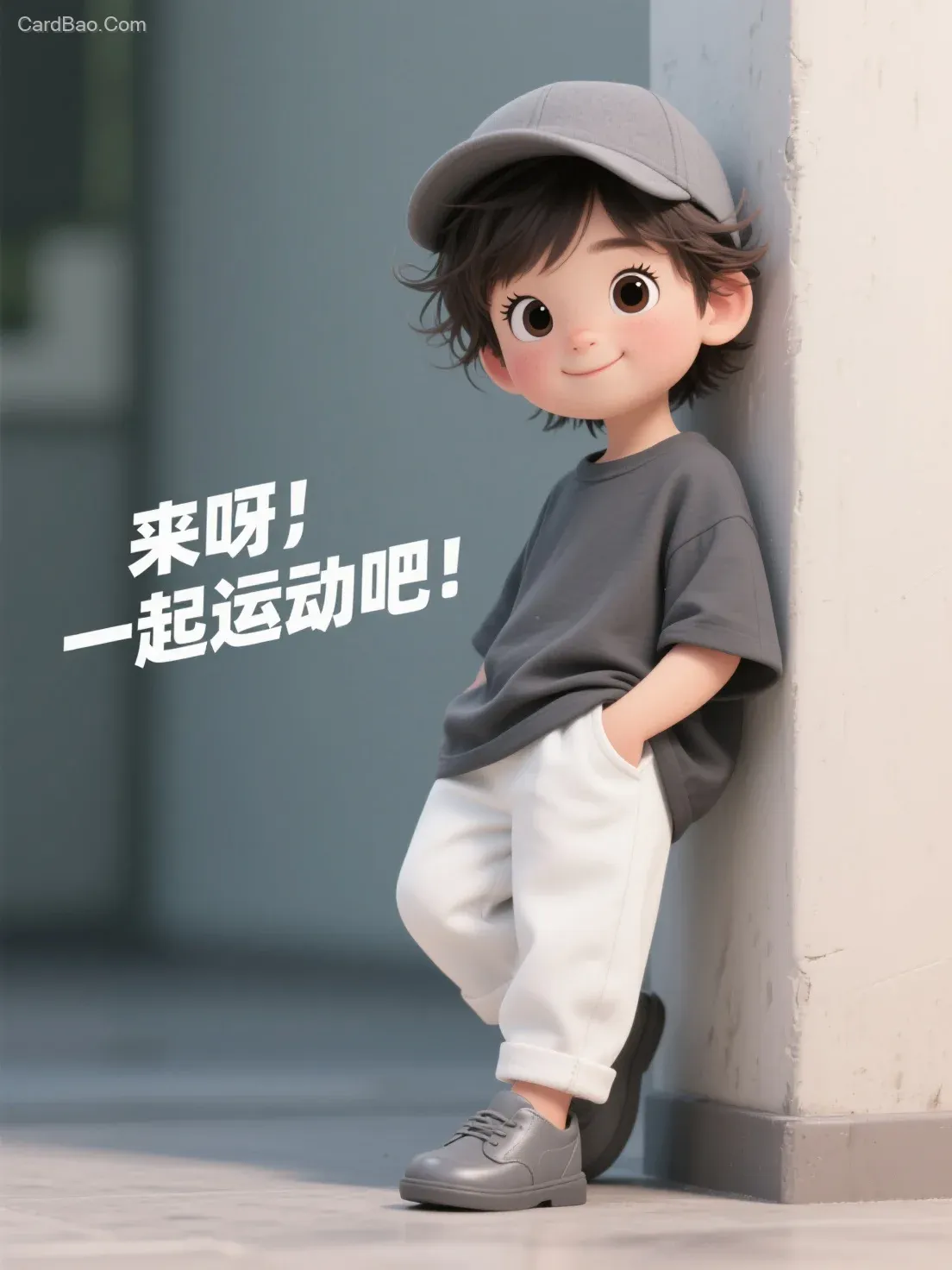 大全景,3D,漫画版,一个可爱的小孩,大眼睛,瓜子脸,长睫毛,小嘴巴,头戴灰色鸭舌帽,发丝凌乱感,穿深灰色七分袖体恤,宽松版,白色裤子,灰色皮鞋,一只手插在口袋里,偷偷的靠在墙角,眼神愉快地看着前方,很轻松惬意的样子,潇洒感,高级感。图片风格为写真,图片上有“来呀,一起运动吧!”。