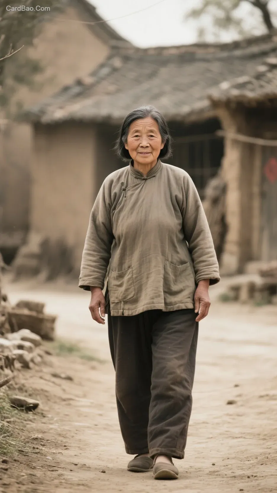 A 55-year-old rural mother, dressed in simple old-fashioned clothes. Long shot, full-body front view. High-definition, 10 meters away from the camera.