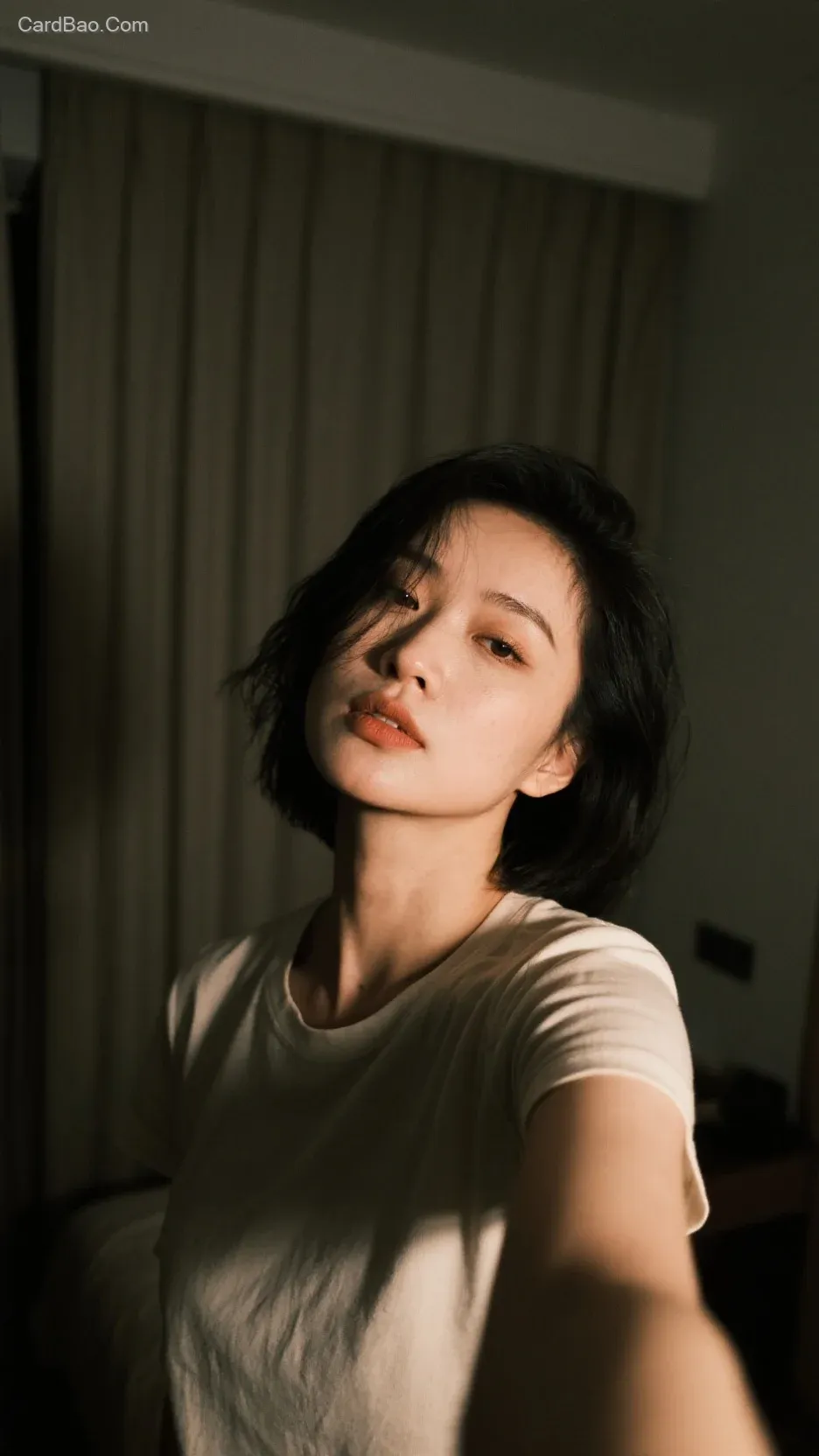 昏暗普通房间,背景为纯色窗帘,自拍构图杂乱,使用前置摄像头自拍,绝美御姐,微距人脸特写,轻微仰角,镜头略偏斜,光线柔和自然,非均匀打光,皮肤质感细腻不均,脸部皮肤哑光自然,鬓角发丝轻微凌乱,身穿浅色系休闲款短袖,自拍时略微抖动造成轻微模糊,表情自然松弛,眼神温柔略显疲惫,照片毫无修饰感,带有生活真实感,胶片质感,轻微噪点