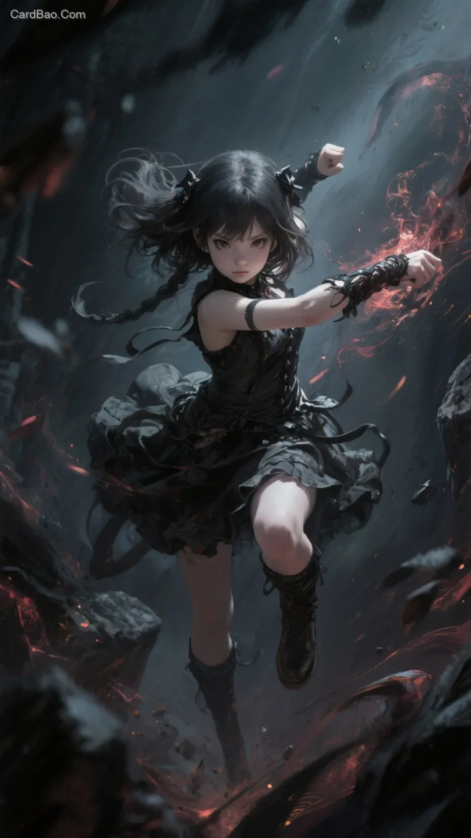 Unreal, dark, oil painting, loli, awe-inspiring, spectacle, macro, suspended in air, combat stance, lighting, fierce expression, bokeh, filter, texture, material quality, detail, redemption, motion blur