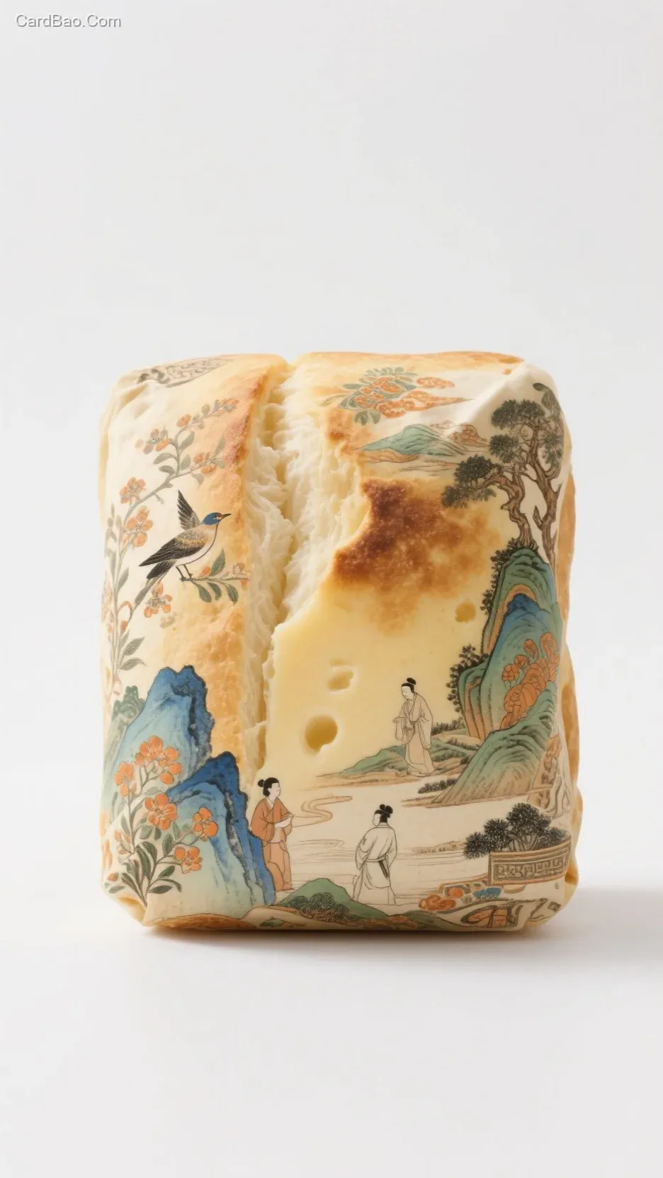 纯白色背景,无任何干扰元素 ,复古插画风,19世纪雕版印刷质感,淡雅水彩晕染效果 ,平面商业插画,模拟纸质纹理 。中心对称构图,岩烧乳奶酪包占据画面80%,超广角微距视角 。柔光无影棚光,均匀照明,零阴影,突出图案细节 。8K高清,锐利焦点,面包褶皱与图案笔触清晰可见 ,生成一张古代国画插图风格装饰岩烧乳奶酪包,白色极简背景,食物与艺术融合