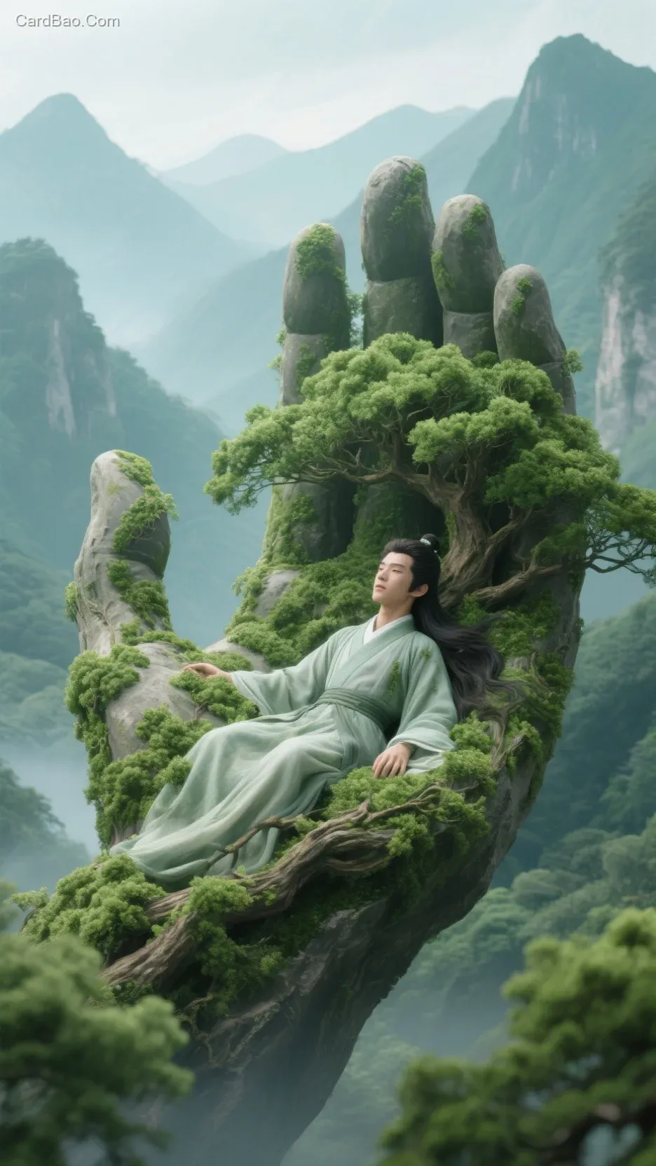 山形如巨手,掌中卧着一个古装青年,身上长满绿树青山环绕,他的头和长发也长满绿树,模样是树,身体是树,唯美诗意的自然场景,3D,电影效果,全景,精致,高清图,人物清澈、灵动,精致,淡雅、梦幻,如诗如画、静谧闲逸的氛围,真人写真