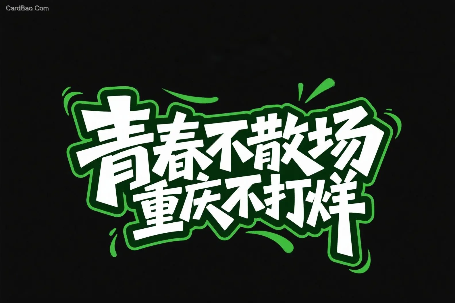 标题字体设计,文字“青春不散场 重庆不打烊”极具个性和街头感的涂鸦字体,充满力度与不规则感流动的、跳跃的效果,字体大小,白色字体,绿色点缀,纯黑色背景。LOGO矢量,大师获奖作品