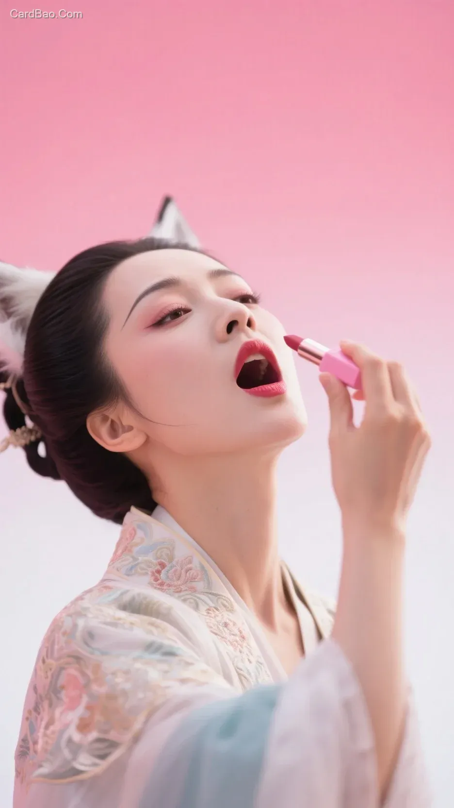 嘴巴微张哈欠的唇部特写,画面聚焦唇部放大,左手拿粉色口红靠近嘴边,脸部占满镜头画面
