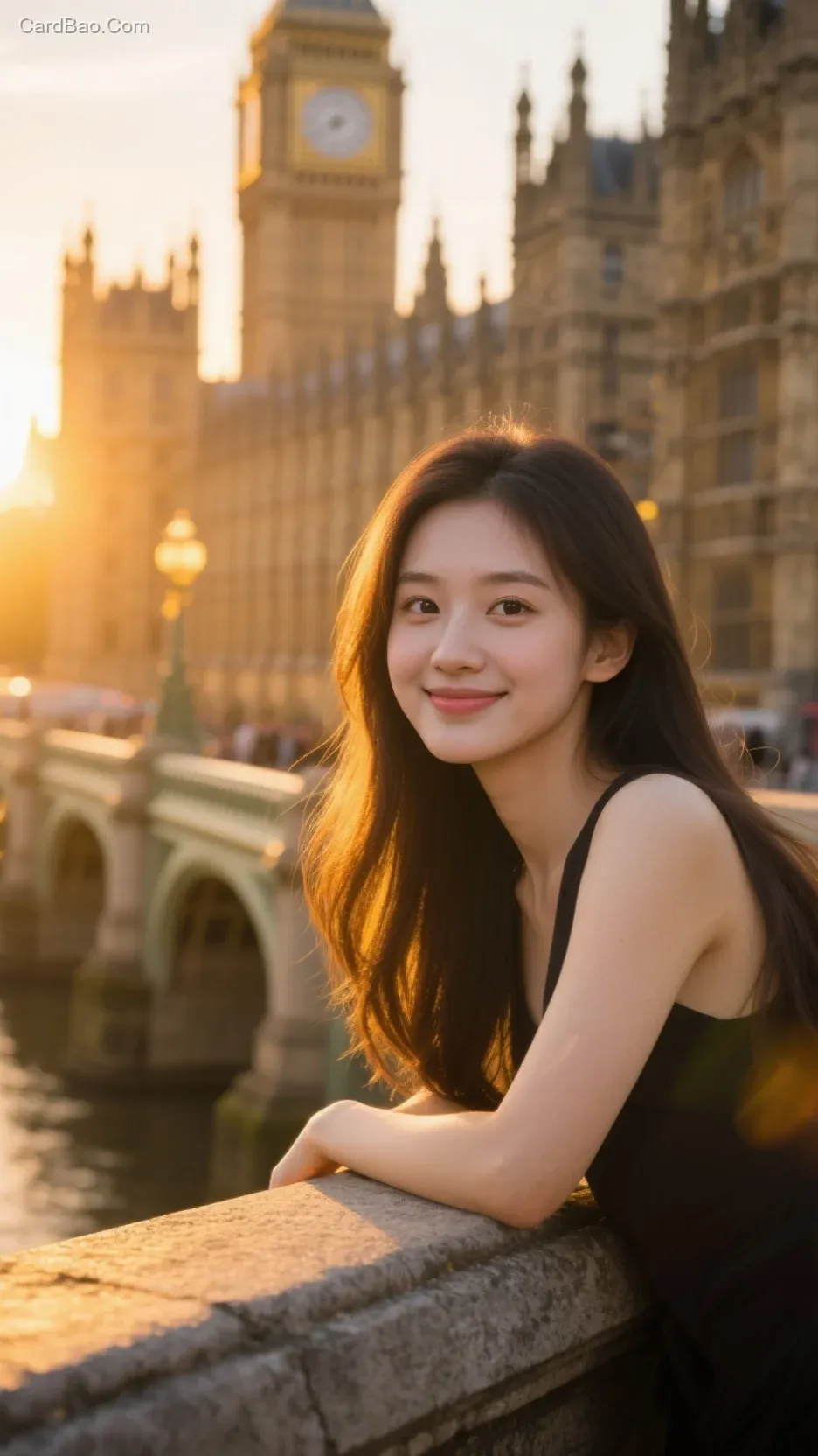 夕阳西下,英国国会大厦,一位漂亮女生,长发,大眼睛双眼皮,眼含笑意,端庄大气,动作自然,靠在石栏上,金黄色的夕阳洒在脸上,有一种金黄色的感觉,背景是国会大厦,有氛围感,超精细,8k分辨率