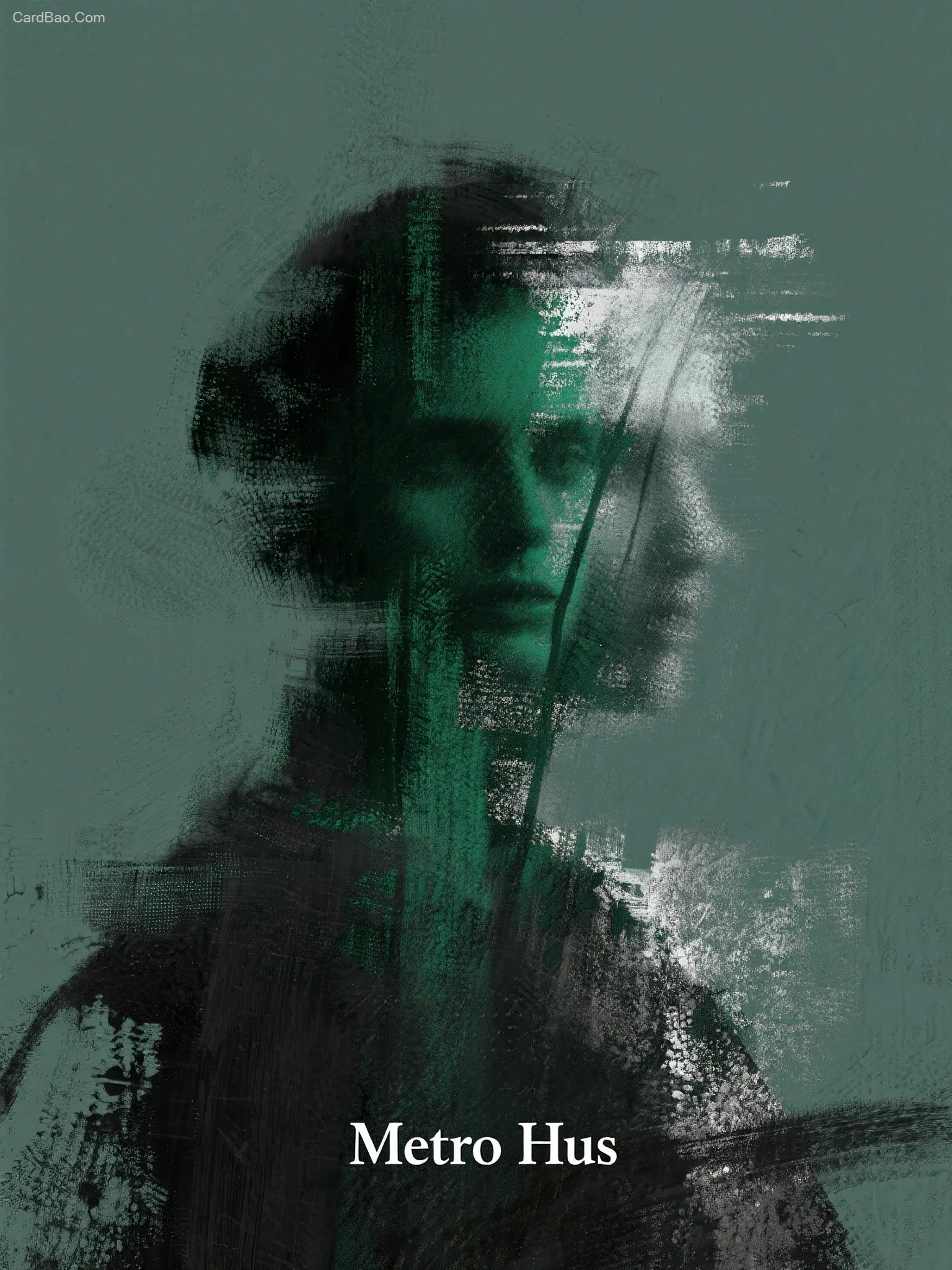纯色背景,暗黑系,枯绿银灰配色,非常规独特构图,大师光影,电影质感,颗粒感,印象派,抽象,朦胧,过曝,双重曝光,抽帧,复古电影风格,矛盾冲突的视觉冲击和有机融合,艺术氛围浓厚,情绪叙事,抽象艺术,获奖作品。极小字“Metro Hus”