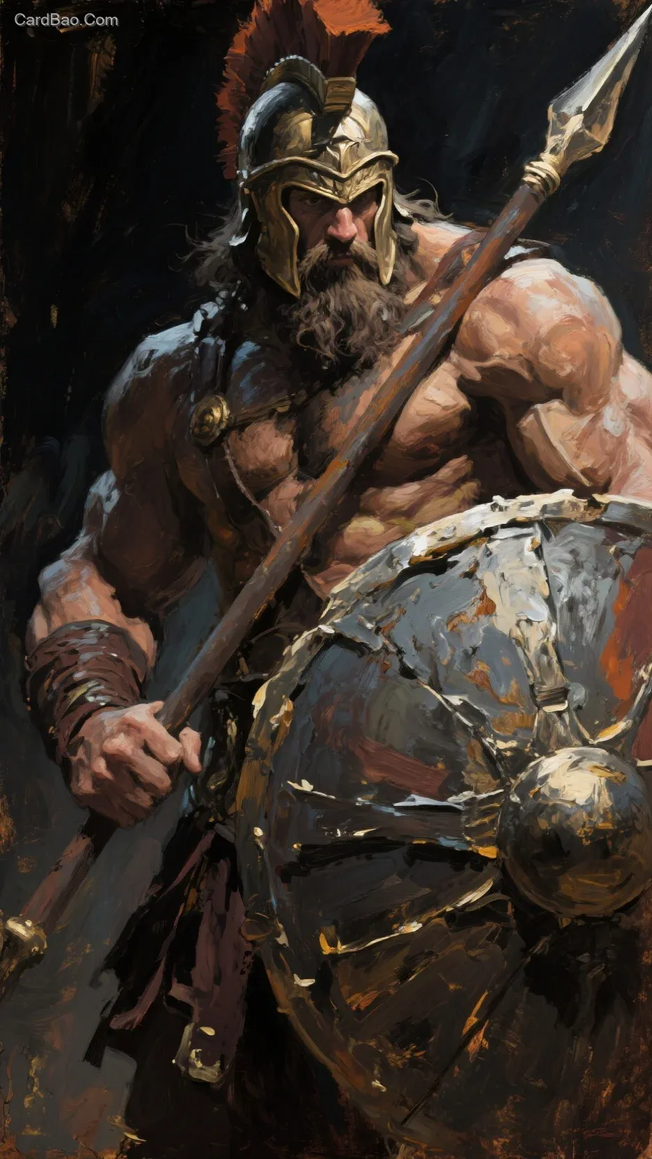 油画,丙烯颜料,特写,视觉冲击,油画颜料厚涂堆砌,粗旷,oc渲染,浅景深,虚实层次,完美光影,笔触飘逸,高清,大师作品,颜料的涂抹感和肌理感,艺术氛围感加强,使背景与前景相互融合,黑暗,采用非传统的构图方式,打破常规,油画,目视镜头,斯巴达勇士,络腮胡,肌肉扎实,近景拍摄,夸张的比例,巨大的身材,长矛盾牌,中心构图。高清画质32K,真实人物写真,突出画面空间感,立体感,对比有力,构图完美,大师级摄影作品,富有冲击力,俯视拍摄,防御状态