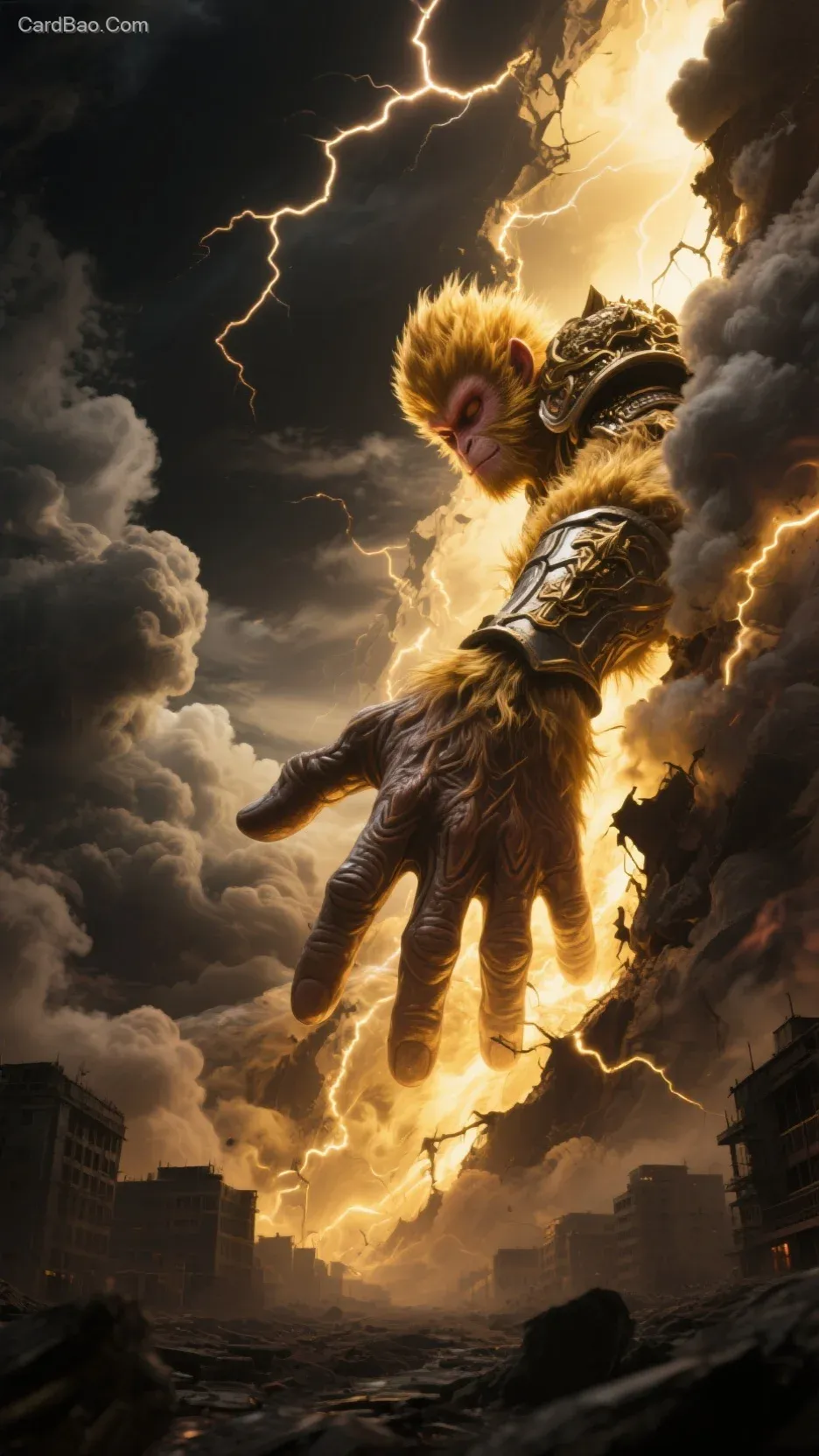 天空崩裂出巨大发光裂缝,孙悟空布满金色毛发和盔甲的巨手从裂缝中伸出,手掌纹路清晰可见,云层剧烈翻滚形成漩涡状,地面建筑在巨手阴影下显得渺小,暗黑色天空与金色光芒形成强烈对比,超现实史诗感画面,超广角低角度镜头,8K写实风格,末日降临的压迫氛围,雷电在裂缝边缘闪烁,动态模糊效果增强巨手运动轨迹