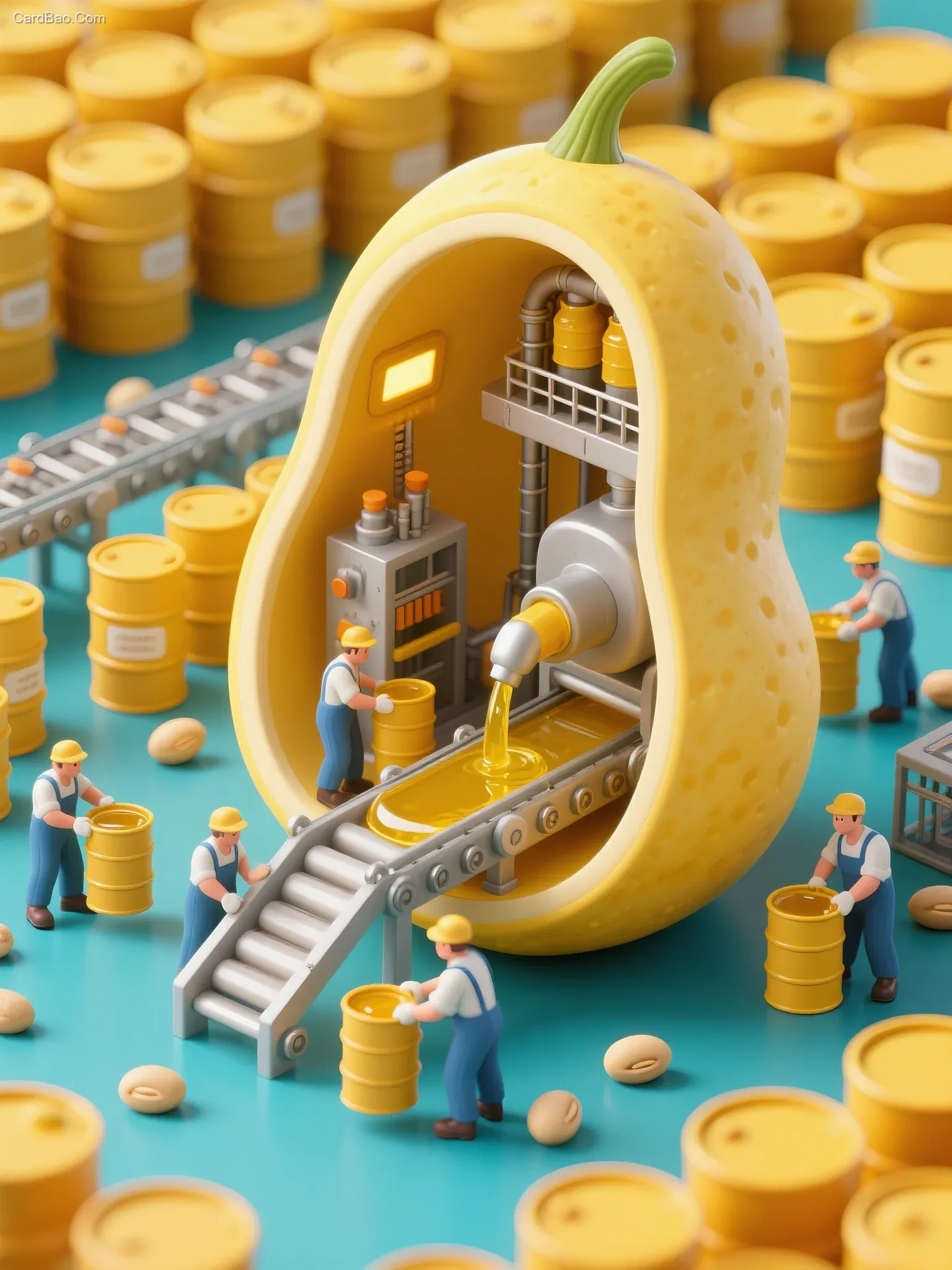 A giant soybean with a miniature factory inside, where the production line is processing the soybean into soybean oil. Workers are busy collecting the oil into barrels, with many barrels lined up behind them. The style is 3D animated and cartoonish, featuring vibrant colors, rich details, ultra-detailed rendering, ultra-high resolution, and a miniature landscape.